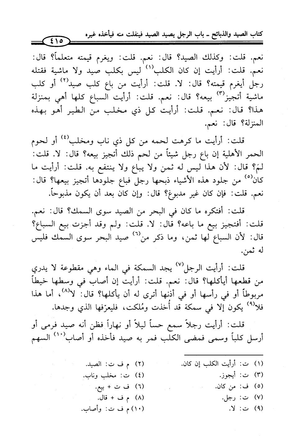 نعم. قلت: وكذلك الصيد؟ قال: نعم. قلت: ويغرم قيمته متعلماً؟ قال: نعم. قلت: أرأيت إن كان الكلب (¬1) ليس بكلب صيد ولا ماشية فقتله رجل أيغرم قيمته؟ قال: لا. قلت: أرأيت من باع كلب صيد (¬2) أو كلب ماشية أتجيز (¬3) بيعه؟ قال: نعم. قلت: أرأيت السباع كلها أهي بمنزلة هذا؟ قال: نعم. قلت: أرأيت كل ذي مخلب من الطير أهو بهذه المنزلة؟ قال: نعم.