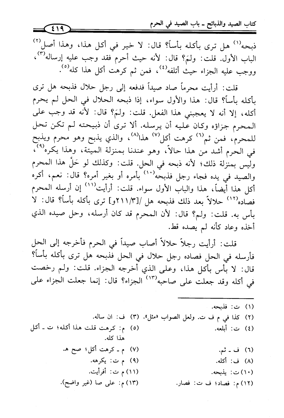 قلت: أرأيت رجلاً حلالاً أصاب صيداً في الحرم فأخرجه إلى الحل فأرسله في الحل فصاده رجل حلال في الحل فذبحه هل ترى بأكله بأساً؟ قال: لا بأس بأكل هذا، وعلى الذي أخرجه الجزاء. قلت: ولم رخصت في أكله وقد جعلت على صاحبه (¬13) الجزاء؟ قال: إنما جعلت الجزاء على