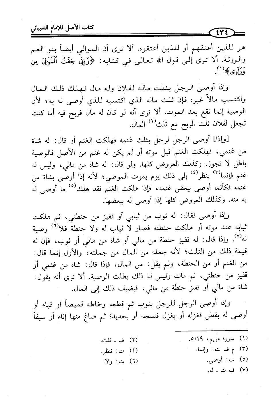 وإذا أوصى فقال: له ثوب من ثيابي أو قفيز من حنطتي، ثم هلكت ثيابه عند موته أو هلكت حنطته فصار لا ثياب له ولا حنطة فلا (¬6) وصية له (¬7). وإذا قال: له قفيز حنطة من مالي أو شاة من مالي أو ثوب، فإن له قيمة ذلك من الثلث؛ لأنه جعله من المال من جملته، والأول إنما قال: من الغنم أو من الحنطة، ولم يقل: من المال، فإذا قال: شاة من غنمي أو قفيز من حنطتي، ثم مات وليس له ذلك بطلت الوصية. ألا ترى أنه يقول: شاة من مالي أو قفيز حنطة من مالي، فيضيف ذلك إلى المال.