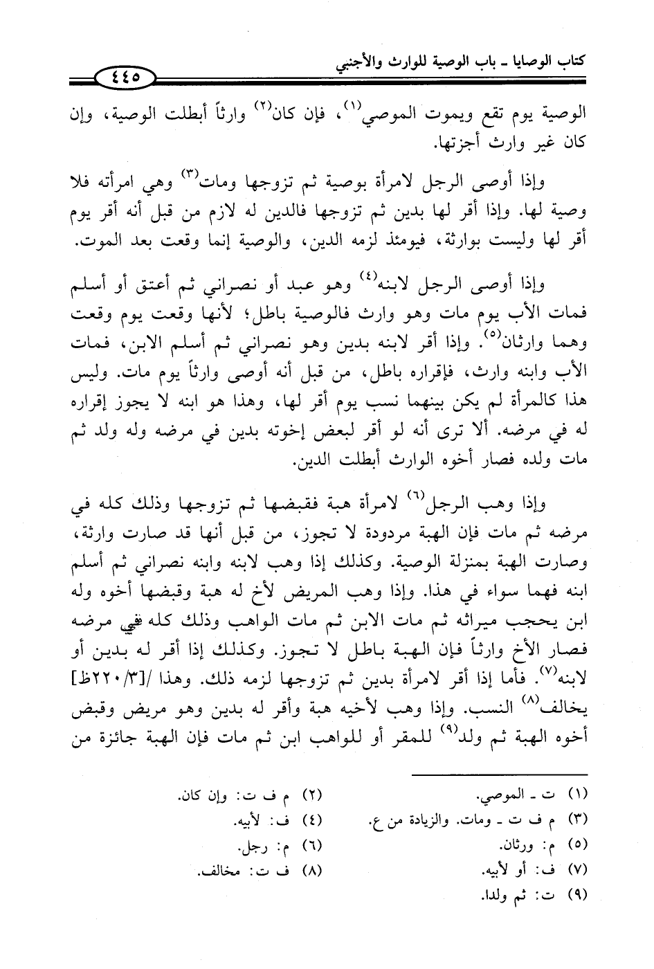 وإذا أوصى الرجل لابنه (¬4) وهو عبد أو نصراني ثم أعتق أو أسلم فمات الأب يوم مات وهو وارث فالوصية باطل؛ لأنها وقعت يوم وقعت وهما وارثان (¬5). وإذا أقر لابنه بدين وهو نصراني ثم أسلم الابن، فمات الأب وابنه وارث، فإقراره باطل، من قبل أنه أوصى وارثاً يوم مات. وليس هذا كالمرأة لم يكن بينهما نسب يوم أقر لها، وهذا هو اينه لا يجوز إقراره له في مرضه. ألا ترى أنه لو أقر لبعض إخوته بدين في مرضه وله ولد ثم مات ولده فصار أخوه الوارث أبطلت الدين.