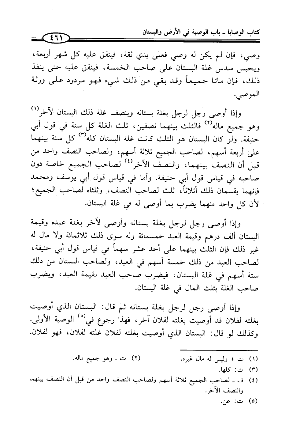 وإذا أوصى رجل لرجل بغلة بستانه وبنصف غلة ذلك البستان لآخر (¬1) وهو جميع ماله (¬2) فالثلث بينهما نصفين، ثلث الغلة كل سنة في قول أبي حنيفة. ولو كان البستان هو الثلث كانت غلة البستان كله (¬3) كل سنة بينهما على أربعة أسهم، لصاحب الجميع ثلاثة أسهم، ولصاحب النصف واحد من قبل أن النصف بينهما، والنصف الآخر (¬4) لصاحب الجميع خاصة دون صاحبه في قياس قول أبي حنيفة. وأما في قياس قول أبي يوسف ومحمد فإنهما يقسمان ذلك أثلاثاً، ثلث لصاحب النصف، وثلثاه لصاحب الجميع؛ لأن كل واحد منهما يضرب بما أوصى له في غلة البستان.