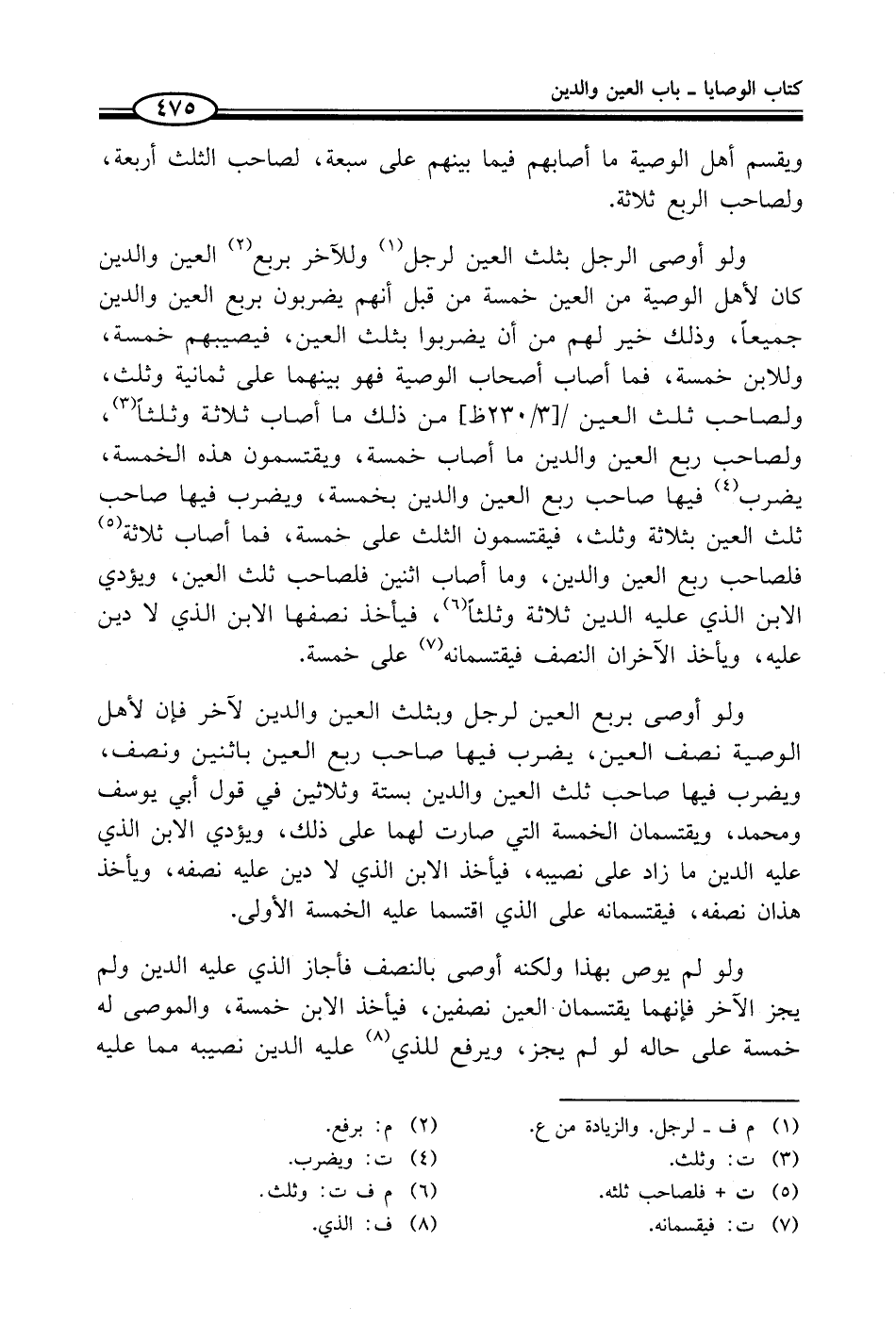 ولو أوصى الرجل بثلث العين لرجل (¬1) وللآخر بربع (¬2) العين والدين كان لأهل الوصية من العين خمسة من قبل أنهم يضربون بربع العين والدين جميعاً، وذلك خير لهم من أن يضربوا بثلث العين، فيصيبهم خمسة، وللابن خمسة، فما أصاب أصحاب الوصية فهو بينهما على ثمانية وثلث، ولصاحب ثلث العين من ذلك ما أصاب ثلاثة وثلثاً (¬3)، ولصاحب ربع العين والدين ما أصاب خمسة، ويقتسمون هذه الخمسة، يضرب (¬4) فيها صاحب ربع العين والدين بخمسة، ويضرب فيها صاحب ثلث العين بثلاثة وثلث، فيقتسمون الثلث على خمسة، فما أصاب ثلاثة (¬5) فلصاحب ربع العين والدين، وما أصاب اثنين فلصاحب ثلث العين، ويؤدي الابن الذي عليه الدين ثلاثة وثلثاً (¬6)، فيأخذ نصفها الابن الذي لا دين عليه، ويأخذ الآخران النصف فيقتسمانه (¬7) على خمسة.