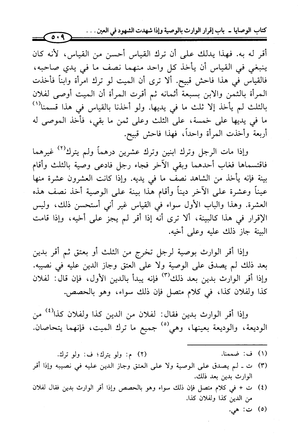 (¬4) ت + في كلام متصل فإن ذلك سواء وهو بالحصص وإذا أقر الوارث بين فقال لفلان من الدين كذا ولفلان كذا.