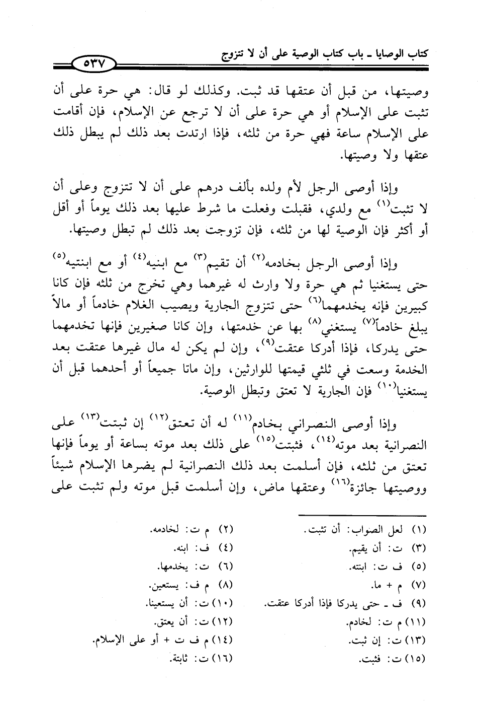 وإذا أوصى النصراني بخادم (¬11) له أن تعتق (¬12) إن ثبتت (¬13) على النصرانية بعد موته (¬14)، فثبتت (¬15) على ذلك بعد موته بساعة أو يوماً فإنها تعتق من ثلثه، فإن أسلمت بعد ذلك النصرانية لم يضرها الإسلام شيئاً ووصيتها جائزة (¬16) وعتقها ماض، وإن أسلمت قبل موته ولم تثبت على