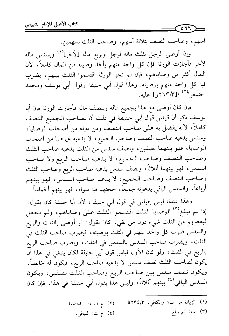 وهذا عندنا ليس بقياس في قول أبي حنيفة، لأن أبا حنيفة كان يقول: إذا لم تبلغ (¬3) الوصايا الثلث اقتسموا الثلث على وصاياهم، ولم يجعل لبعضهم من الثلث شيء دون من بقي، كان يقول: لو أوصى بالثلث والربع والسدس ضرب كل واحد منهم في الثلث بوصيته، فيضرب صاحب الثلث في الثلث، ويضرب صاحب السدس بالسدس في الثلث، ويضرب صاحب الربع بالربع في الثلث، ولو كان الأول قياس قول أبي حنيفة لكان ينبغي في هذا أن يكون لصاحب الثلث نصف سدس لا يدعيه صاحب الربع، فيكون له خالصًا، ويكون نصف سدس بين صاحب الربع وصاحب الثلث نصفين، ويكون السدس الباقي (¬4) بينهم أثلاثاً، وليس هذا بقول أبي حنيفة في هذا، فإن كان