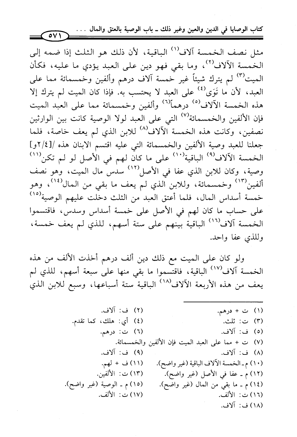 مثل نصف الخمسة آلاف (¬1) الباقية، لأن ذلك هو الثلث إذا ضمه إلى الخمسة الآلاف (¬2)، وما بقي فهو دين على العبد يؤدي ما عليه، فكأن الميت (¬3) لم يترك شيئاً غير خمسة آلاف درهم وألفين وخمسمائة مما على العبد، لأن ما تَوَى (¬4) على العبد لا يحتسب به. فإذا كان الميت لم يترك إلا هذه الخمسة الآلاف (¬5) درهماً (¬6) وألفين وخمسمائة مما على العبد الميت فإن الألفين والخمسمائة (¬7) التي على العبد لولا الوصية كانت بين الوارثين نصفين، وكانت هذه الخمسة الآلاف (¬8) للابن الذي لم يعف خاصة، فلما جعلنا للعبد وصية الألفين والخمسمائة التي عليه اقتسم الابنان هذه الخمسة الآلاف (¬9) الباقية (¬10) على ما كان لهم في الأصل لو لم تكن (¬11) وصية، وكان للابن الذي عفا في الأصل (¬12) سدس مال الميت، وهو نصف ألفين (¬13) وخمسمائة، وللابن الذي لم يعف ما بقي من المال (¬14)، وهو خمسة أسداس المال، فلما أعتق العبد من الثلث دخلت عليهم الوصية (¬15) على حساب ما كان لهم في الأصل على خمسة أسداس وسدس، فاقتسموا الخمسة آلاف (¬16) الباقية بينهم على ستة أسهم، للذي لم يعف خمسة، وللذي عفا واحد.