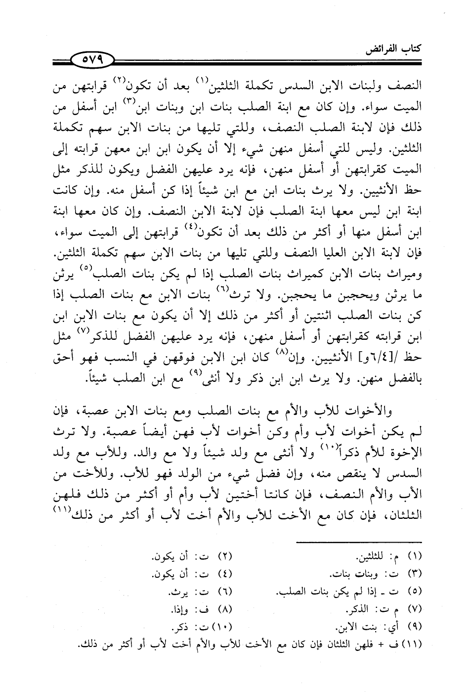 النصف ولبنات الابن السدس تكملة الثلثين (¬1) بعد أن تكون (¬2) قرابتهن من الميت سواء. وإن كان مع ابنة الصلب بنات ابن وبنات ابن (¬3) ابن أسفل من ذلك فإن لابنة الصلب النصف، وللتي تليها من بنات الابن سهم تكملة الثلثين. وليس للتي أسفل منهن شيء إلا أن يكون ابن ابن معهن قرابته إلى الميت كقرابتهن أو أسفل منهن، فإنه يرد عليهن الفضل ويكون للذكر مثل حظ الأنثيين. ولا يرث بنات ابن مع ابن شيئاً إذا كن أسفل منه. وإن كانت ابنة ابن ليس معها ابنة الصلب فإن لابنة الابن النصف. وإن كان معها ابنة ابن أسفل منها أو أكثر من ذلك بعد أن تكون (¬4) قرابتهن إلى الميت سواء، فإن لابنة الابن العليا النصف وللتي تليها من بنات الابن سهم تكملة الثلثين. وميراث بنات الابن كميراث بنات الصلب إذا لم يكن بنات الصلب (¬5) يرثن ما يرثن ويحجبن ما يحجبن. ولا ترث (¬6) بنات الابن مع بنات الصلب إذا كن بنات الصلب اثنتين أو أكثر من ذلك إلا أن يكون مع بنات الابن ابن ابن قرابته كقرابتهن أو أسفل منهن، فإنه يرد عليهن الفضل للذكر (¬7) مثل حظ الأنثيين. وإن (¬8) كان ابن الابن فوقهن في النسب فهو أحق بالفضل منهن. ولا يرث ابن ابن ذكر ولا أنثى (¬9) مع ابن الصلب شيئاً.
