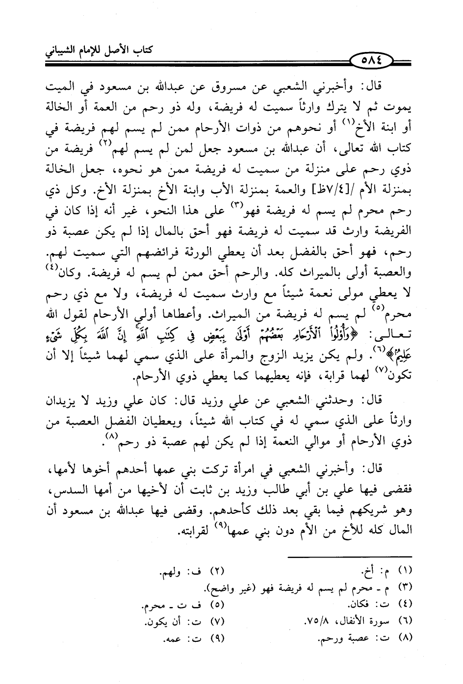 قال: وأخبرني الشعبي عن مسروق عن عبد الله بن مسعود في الميت يموت ثم لا يترك وارثاً سميت له فريضة، وله ذو رحم من العمة أو الخالة أو ابنة الأخ (¬1) أو نحوهم من ذوات الأرحام ممن لم يسم لهم فريضة في كتاب الله تعالى، أن عبد الله بن مسعود جعل لمن لم يسم لهم (¬2) فريضة من ذوي رحم على منزلة من سميت له فريضة ممن هو نحوه، جعل الخالة بمنزلة الأم والعمة بمنزلة الأب وابنة الأخ بمنزلة الأخ. وكل ذي رحم محرم لم يسم له فريضة فهو (¬3) على هذا النحو، غير أنه إذا كان في الفريضة وارث قد سميت له فريضة فهو أحق بالمال إذا لم يكن عصبة ذو رحم، فهو أحق بالفضل بعد أن يعطي الورثة فرائضهم التي سميت لهم. والعصبة أولى بالميراث كله. والرحم أحق ممن لم يسم له فريضة. وكان (¬4) لا يعطي مولى نعمة شيئاً مع وارث سميت له فريضة، ولا مع ذي رحم محرم (¬5) لم يسم لهِ فريضة من الميراث. وأعطاها أولي الأرحام لقول الله تعالى: {وَأُولُو الْأَرْحَامِ بَعْضُهُمْ أَوْلَى بِبَعْضٍ فِي كِتَابِ اللَّهِ إِنَّ اللَّهَ بِكُلِّ شَيْءٍ عَلِيمٌ} (¬6). ولم يكن يزيد الزوج والمرأة على الذي سمي لهما شيئاً إلا أن تكون (¬7) لهما قرابة، فإنه يعطيهما كما يعطي ذوي الأرحام.