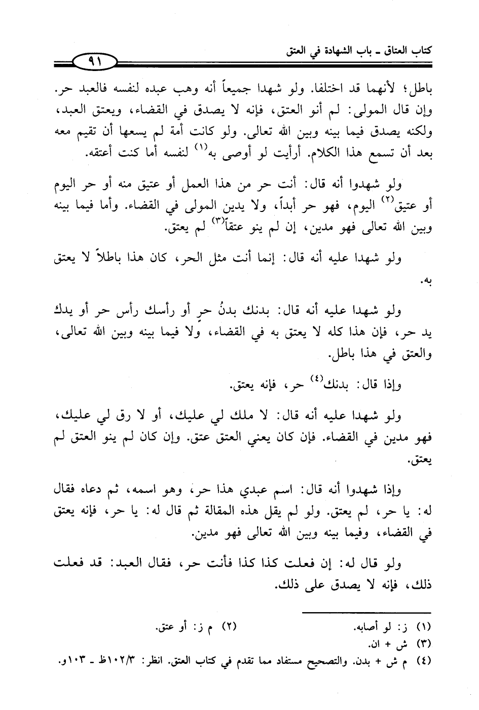 باطل؛ لأنهما قد اختلفا. ولو شهدا جميعاً أنه وهب عبده لنفسه فالعبد حر. وإن قال المولى: لم أنو العتق، فإنه لا يصدق في القضاء، ويعتق العبد، ولكنه يصدق فيما بينه وبين الله تعالى. ولو كانت أمة لم يسعها أن تقيم معه بعد أن تسمع هذا الكلام. أرأيت لو أوصى به (¬1) لنفسه أما كنت أعتقه.
