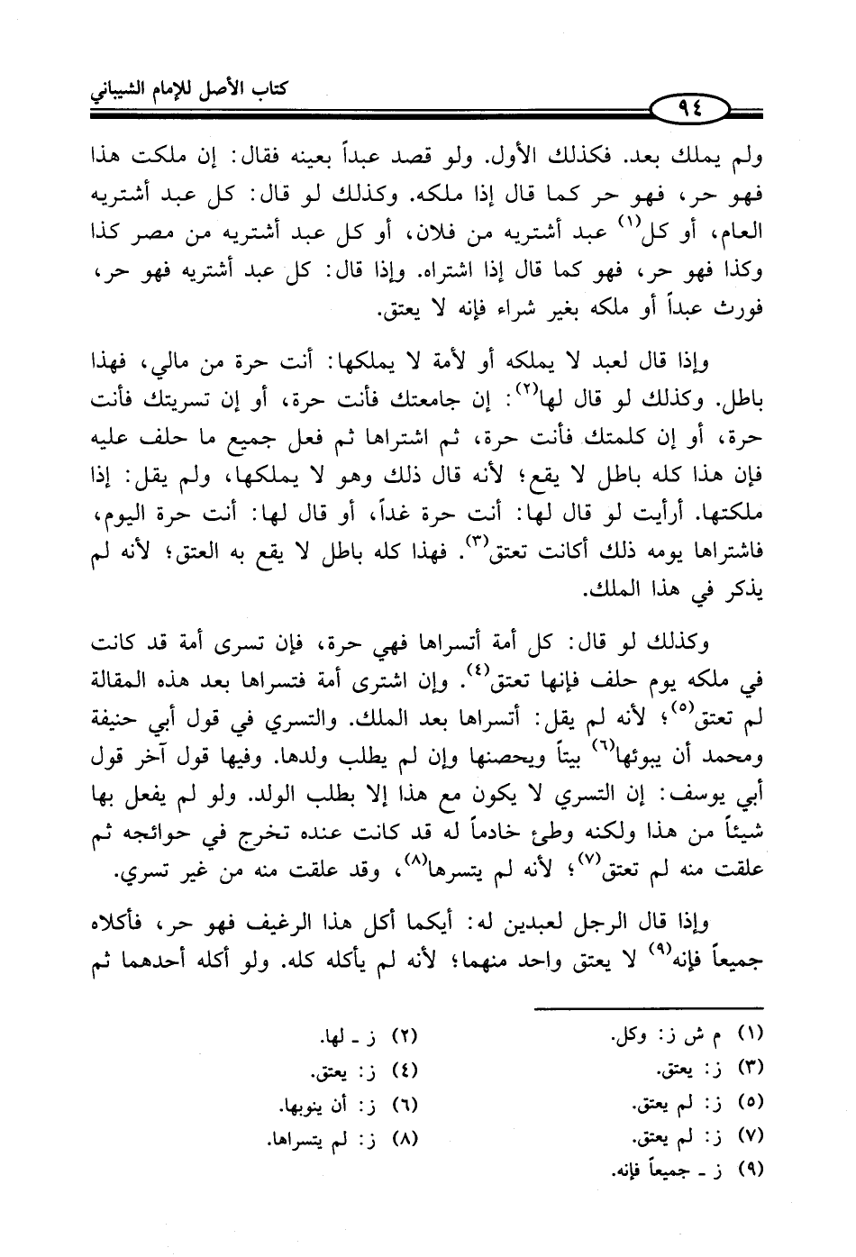 وكذلك لو قال: كل أمة أتسراها فهي حرة، فإن تسرى أمة قد كانت في ملكه يوم حلف فإنها تعتق (¬4). وإن اشترى أمة فتسراها بعد هذه المقالة لم تعتق (¬5)؛ لأنه لم يقل: أتسراها بعد الملك. والتسري في قول أبي حنيفة ومحمد أن يبوئها (¬6) بيتاً ويحصنها وإن لم يطلب ولدها. وفيها قول آخر قول أبي يوسف: إن التسري لا يكون مع هذا إلا بطلب الولد. ولو لم يفعل بها شيئاً من هذا ولكنه وطئ خادماً له قد كانت عنده تخرج في حوائجه ثم علقت منه لم تعتق (¬7)؛ لأنه لم يتسرها (¬8)، وقد علقت منه من غير تسري.
