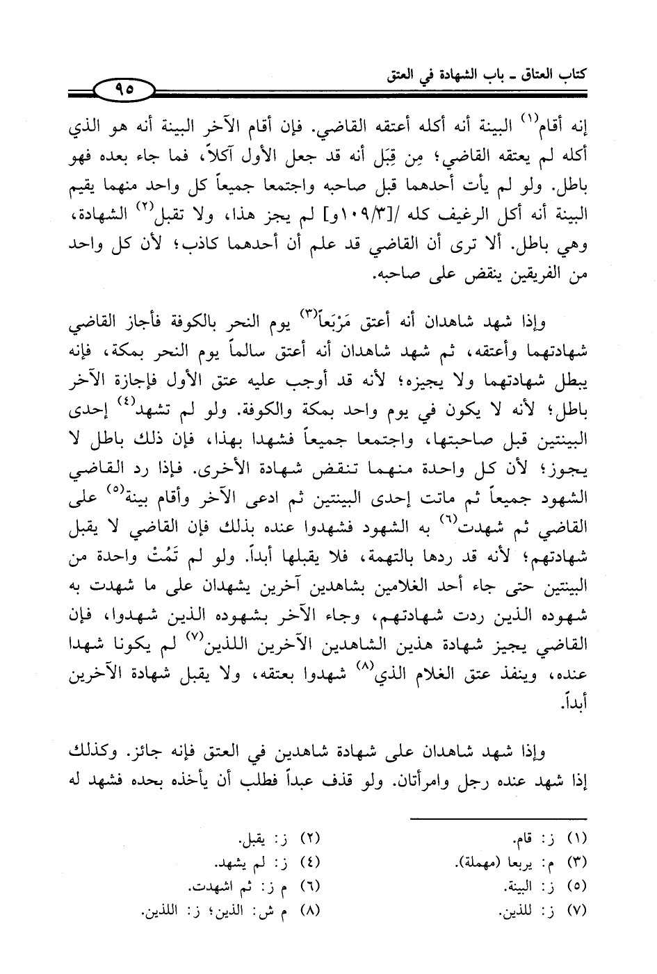 وإذا شهد شاهدان أنه أعتق مَرْبَعاً (¬3) يوم النحر بالكوفة فأجاز القاضي شهادتهما وأعتقه، ثم شهد شاهدان أنه أعتق سالماً يوم النحر بمكة، فإنه يبطل شهادتهما ولا يجيزه؛ لأنه قد أوجب عليه عتق الأول فإجازة الآخر باطل؛ لأنه لا يكون في يوم واحد بمكة والكوفة. ولو لم تشهد (¬4) إحدى البينتين قبل صاحبتها، واجتمعا جميعاً فشهدا بهذا، فإن ذلك باطل لا يجوز؛ لأن كل واحدة منهما تنقض شهادة الأخرى. فإذا رد القاضي الشهود جميعاً ثم ماتت إحدى البينتين ثم ادعى الآخر وأقام بينة (¬5) على القاضي ثم شهدت (¬6) به الشهود فشهدوا عنده بذلك فإن القاضي لا يقبل شهادتهم؛ لأنه قد ردها بالتهمة، فلا يقبلها أبداً. ولو لم تَمُتْ واحدة من البينتين حتى جاء أحد الغلامين بشاهدين آخرين يشهدان على ما شهدت به شهوده الذين ردت شهادتهم، وجاء الآخر بشهوده الذين شهدوا، فإن القاضي يجيز شهادة هذين الشاهدين الآخرين اللذين (¬7) لم يكونا شهدا عنده، وينفذ عتق الغلام الذي (¬8) شهدوا بعتقه، ولا يقبل شهادة الآخرين أبداً.