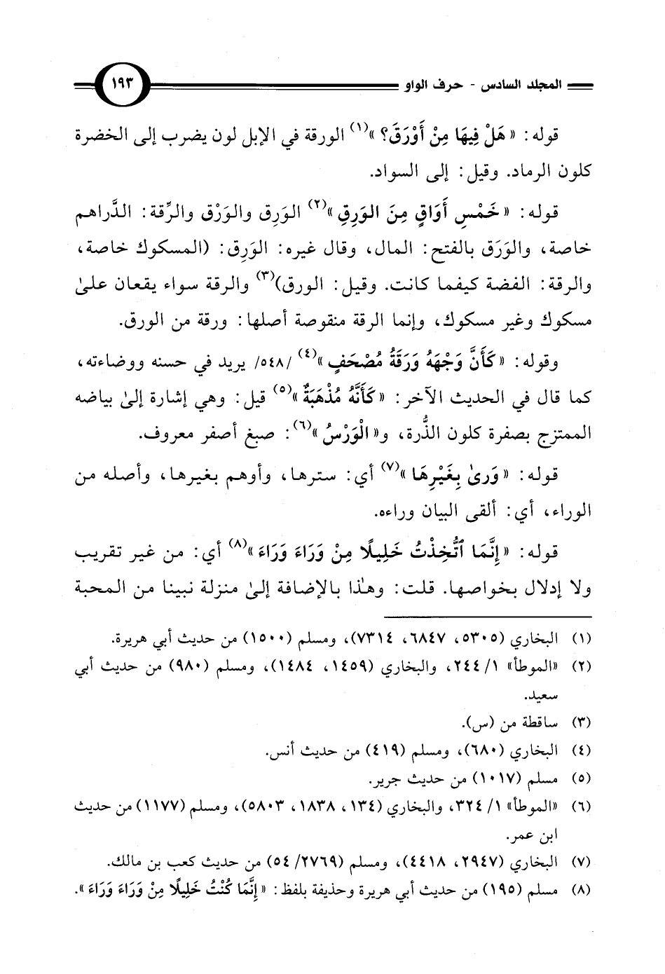 وقوله: "كَأَنَّ وَجْهَهُ وَرَقَةُ مُصْحَفٍ" (¬4) يريد في حسنه ووضاءته، كما قال في الحديث الآخر: "كَأَنَّهُ مُذْهَبَةٌ" (¬5) قيل: وهي إشارة إلى بياضه الممتزج بصفرة كلون الذُّرة، و"الْوَرْسُ" (¬6): صبغ أصفر معروف.