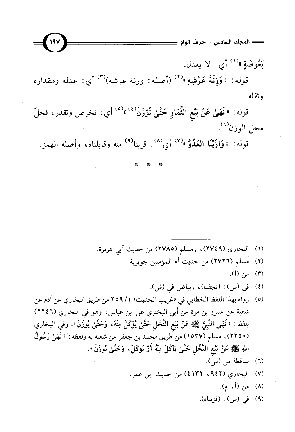 (¬5) رواه بهذا اللفظ الخطابي في "غريب الحديث" 1/ 259 من طريق البخاري عن آدم عن شعبة عن عمرو بن مرة عن أبي البختري عن ابن عباس، وهو في البخاري (2246) بلفظ: "نَهَى النَّبِيُّ - صلى الله عليه وسلم - عَنْ بَيْعِ النَّخْلِ حَتَّى يُؤكَلَ مِنْهُ، وَحَتَّى يُوزَنَ". وفي البخاري (2250)، مسلم (1537) من طريق محمَّد بن جعفر عن شعبه به ولفظه: "نَهَى رَسُولُ اللهِ - صلى الله عليه وسلم - عَنْ بَيْعِ النَّخْلِ حَتَّى يَأْكُلَ مِنْهُ أَوْ يُؤْكلَ، وَحَتَّى يُوزَنَ".