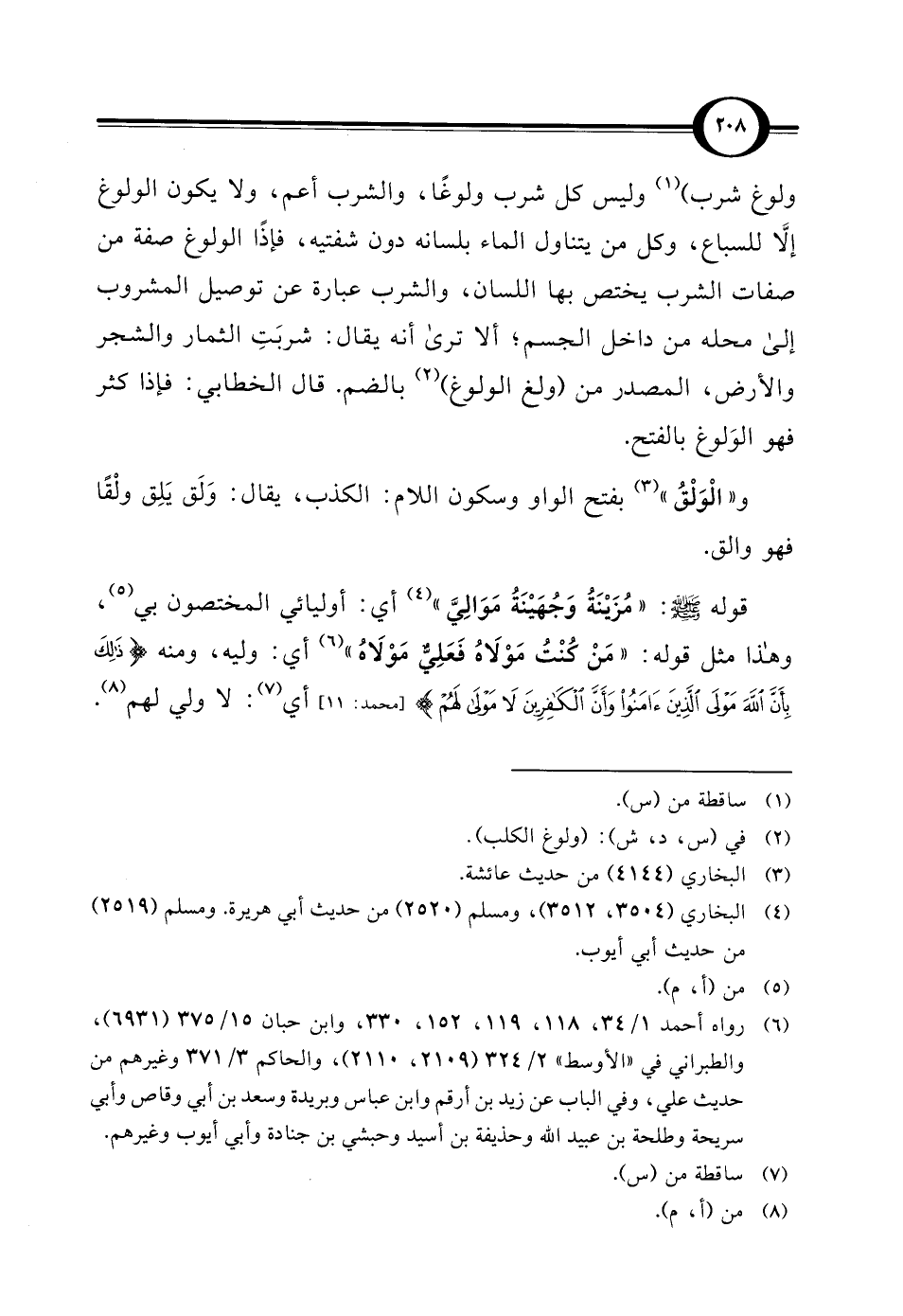قوله - صلى الله عليه وسلم -: "مُزَيْنَةُ وَجُهَيْنَةُ مَوَالِيَّ" (¬4) أي: أوليائي المختصون بي (¬5)، وهذا مثل قوله: "مَنْ كُنْتُ مَوْلَاهُ فَعَلِيٌّ مَوْلَاهُ" (¬6) أي: وليه، ومنه {ذَلِكَ بِأَنَّ اللَّهَ مَوْلَى الَّذِينَ آمَنُوا وَأَنَّ الْكَافِرِينَ لَا مَوْلَى لَهُمْ} [محمد: 11] أي (¬7): لا ولي لهم (¬8).