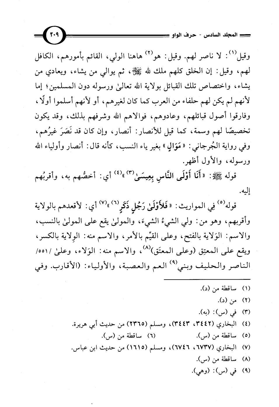 وقيل (¬1): لا ناصر لهم. وقيل: هو (¬2) هاهنا الولي، القائم بأمورهم، الكافل لهم، وقيل: إن الخلق كلهم ملك لله عزوجل، ثم يوالي من يشاء، ويعادي من يشاء، واختصاص تلك القبائل بولاية الله تعالى ورسوله دون المسلمين؛ إما لأنهم لم يكن لهم حلفاء من العرب كما كان لغيرهم، أو لأنهم أسلموا أولاً، وفارقوا أصول قبائلهم، وعادوهم، فوالاهم الله وشرفهم بذلك، وقد يكون تخصيصًا لهم وسمة، كما قيل للأنصار: أنصار، وإن كان قد نَصَرَ غيرُهم، وفي رواية الجُرجاني: "مَوَالٍ" بغير ياء النسب، كأنه قال: أنصار وأولياء الله ورسوله، والأول أظهر.
