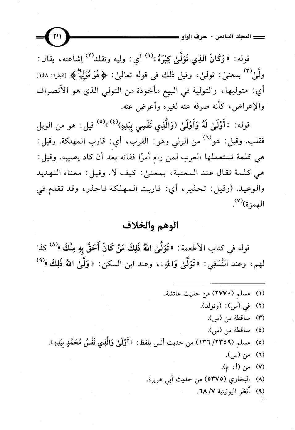قوله: "أَوْلَى لَهُ وَأَوْلَى (وَالَّذِي نَفْسِي بِيَده (¬4) " (¬5) قيل: هو من الويل فقلب. وقيل: هو (¬6) من الولي وهو: القرب، أي: قارب المهلكة. وقيل: هي كلمة تستعملها العرب لمن رام أمرًا ففاته بعد أن كاد يصيبه. وقيل: هي كلمة تقال عند المعتبة، بمعنى: كيف لا. وقيل: معناه التهديد والوعيد. (وقيل: تحذير، أي: قاربت المهلكة فاحذر، وقد تقدم في الهمزة) (¬7).