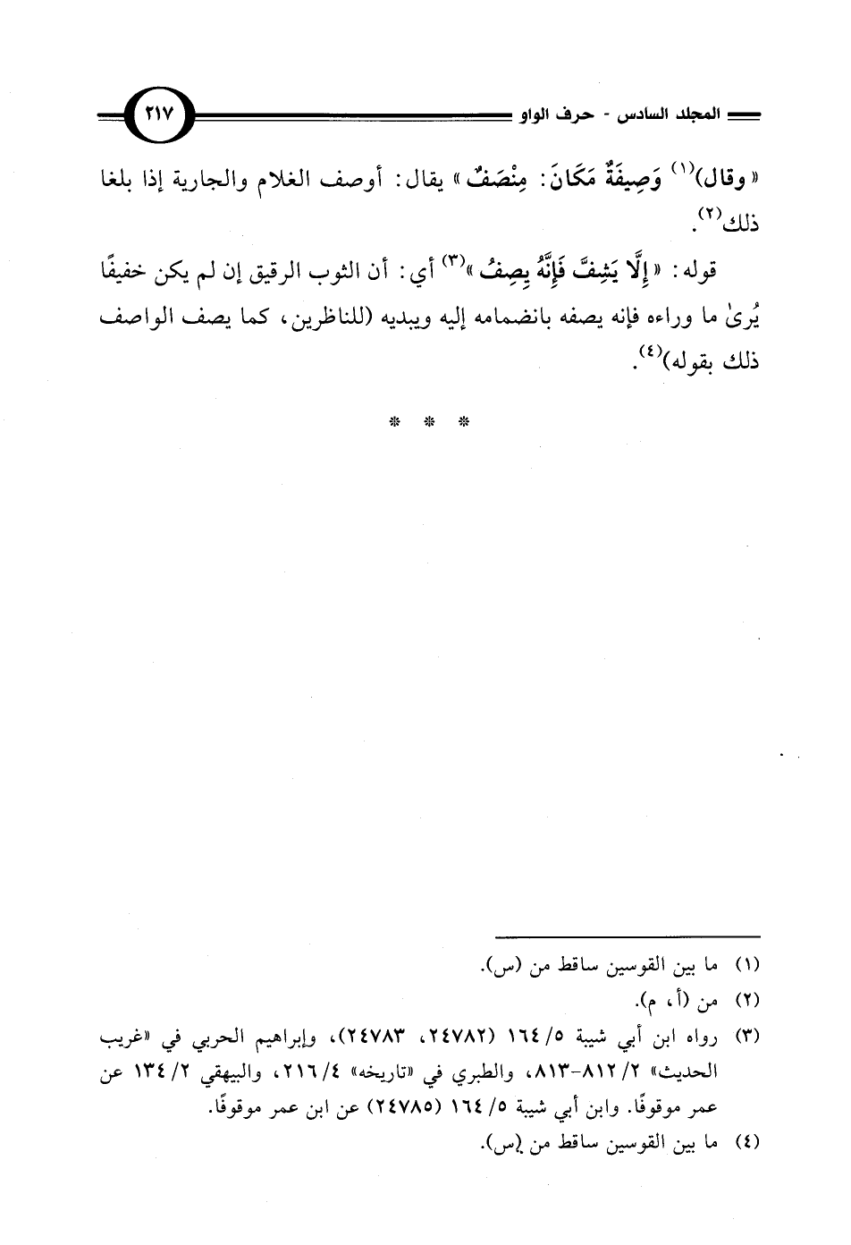 قوله: "إِلَّا يَشِفَّ فَإنَّهُ يِصِفُ" (¬3) أي: أن الثوب الرقيق إن لم يكن خفيفًا يُرى ما وراءه فإنه يصفه بانضمامه إليه ويبديه (للناظرين، كما يصف الواصف ذلك بقوله) (¬4).