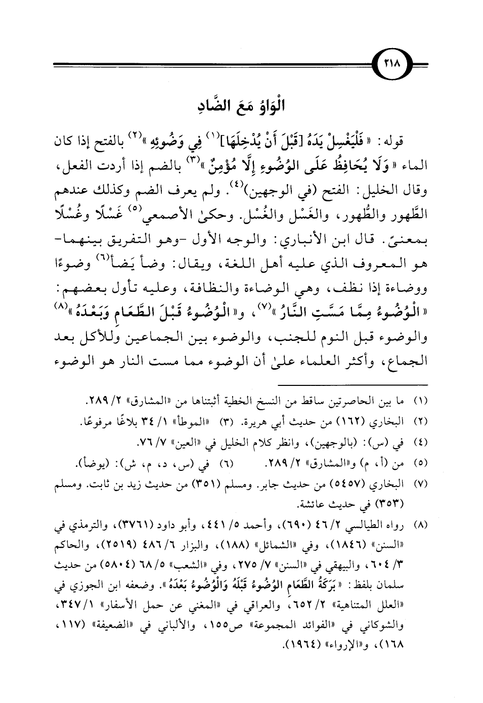 قوله: "فَلْيَغْسِلْ يَدَهُ [قَبْلَ أَنْ يُدْخِلَهَا] (¬1) في وَضُوئِهِ" (¬2) بالفتح إذا كان الماء "وَلَا يُحَافِظُ عَلَى الوُضُوءِ إِلَّا مُؤْمِنٌ" (¬3) بالضم إذا أردت الفعل، وقال الخليل: الفتح (في الوجهين) (¬4). ولم يعرف الضم وكذلك عندهم الطَّهور والطُّهور، والغَسْل والغُسْل. وحكى الأصمعي (¬5) غَسْلًا وغُسْلًا بمعنىً. قال ابن الأنباري: والوجه الأول - وهو التفريق بينهما - هو المعروف الذي عليه أهل اللغة، ويقال: وضأ يَضأ (¬6) وضوءًا ووضاءة إذا نظف، وهي الوضاءة والنظافة، وعليه تأول بعضهم: "الْوُضُوءُ مِمَّا مَسَّتِ النَّارُ" (¬7)، و"الْوُضُوءُ قَبْلَ الطَّعَامِ وَبَعْدَهُ" (¬8) والوضوء قبل النوم للجنب، والوضوء بين الجماعين وللأكل بعد الجماع، وأكثر العلماء على أن الوضوء مما مست النار هو الوضوء