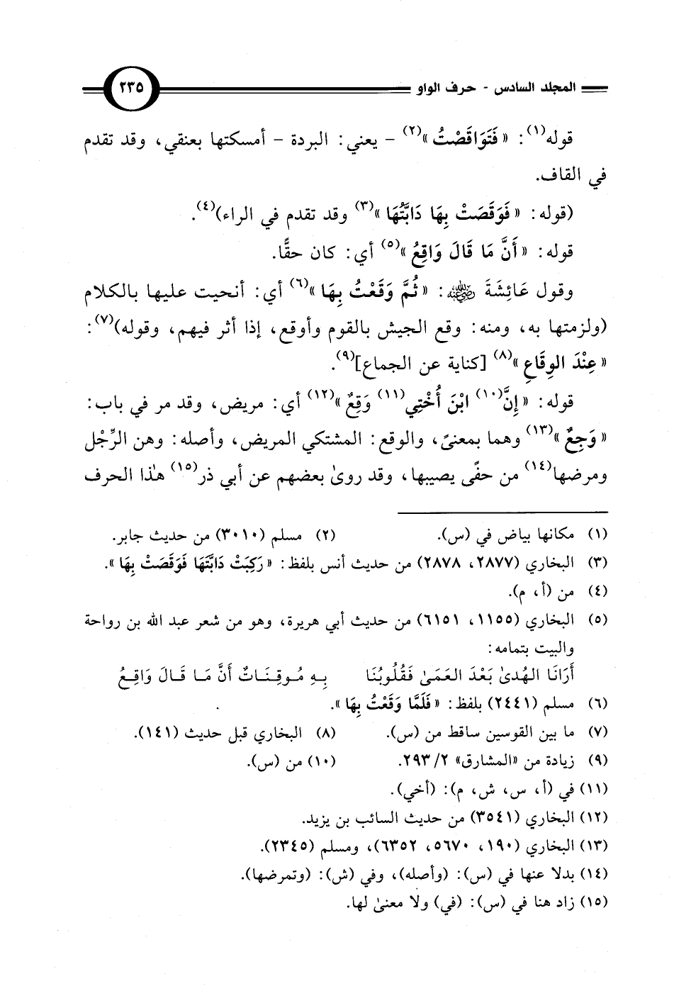 (قوله: "فَوَقَصَتْ بِهَا دَابَّتُهَا" (¬3) وقد تقدم في الراء) (¬4).