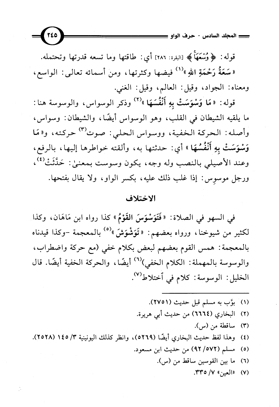 في السهو في الصلاة: "فَتَوَسْوَسَ القَوْمُ" كذا رواه ابن مَاهَان، وكذا لكثير من شيوخنا، ورواه بعضهم: "تَوَشْوَشَ" (¬5) بالمعجمة - وكذا قيدناه بالمعجمة: همس القوم بعضهم لبعض بكلام خفي (مع حركة واضطراب، والوسوسة بالمهملة: الكلام الخفي) (¬6) أيضًا، والحركة الخفية أيضًا. قال الخليل: الوسوسة: كلام في اختلاط (¬7).