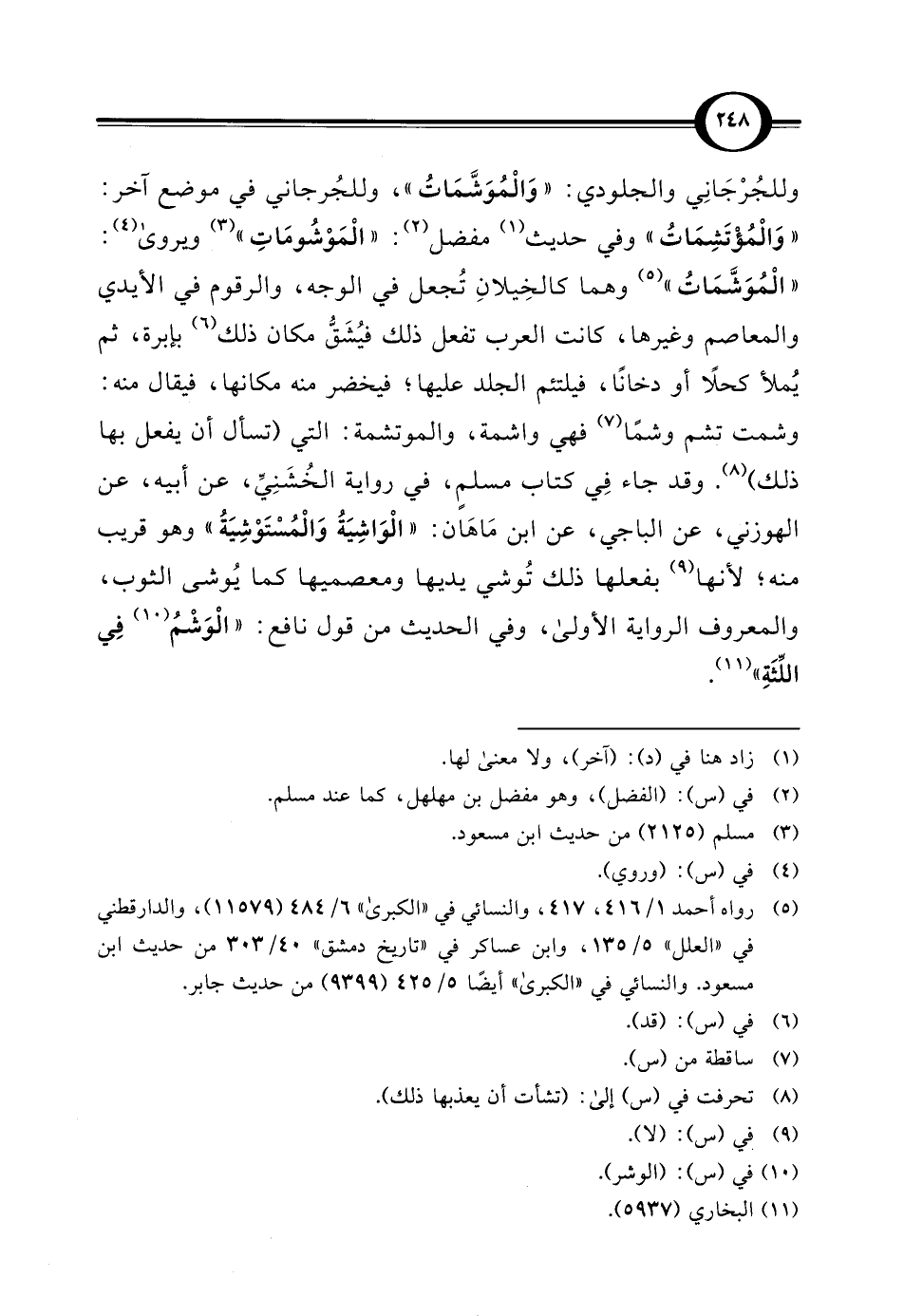 وللجُرْجَانِي والجلودي: "وَالْمُوَشَّمَاتُ"، وللجُرجاني في موضع آخر: "وَالْمُؤْتَشِمَاتُ" وفي حديث (¬1) مفضل (¬2): "الْمَوْشُومَاتِ" (¬3) ويروى (¬4): "الْمُوَشَّمَاتُ" (¬5) وهما كالخِيلانِ تُجعل في الوجه، والرقوم في الأيدي والمعاصم وغيرها، كانت العرب تفعل ذلك فيُشَقُّ مكان ذلك (¬6) بإبرة، ثم يُملأ كحلًا أو دخانًا، فيلتئم الجلد عليها؛ فيخضر منه مكانها، فيقال منه: وشمت تشم وشمًا (¬7) فهي واشمة، والموتشمة: التي (تسأل أن يفعل بها ذلك) (¬8). وقد جاء في كتاب مسلمٍ، في رواية الخُشَنِيِّ، عن أبيه، عن الهوزني، عن الباجي، عن ابن مَاهَان: "الْوَاشِيَةُ وَالْمُسْتَوْشِيَةُ" وهو قريب منه؛ لأنها (¬9) بفعلها ذلك تُوشي يديها ومعصميها كما يُوشى الثوب، والمعروف الرواية الأولى، وفي الحديث من قول نافع: "الْوَشْمُ (¬10) في اللِّثَةِ" (¬11).