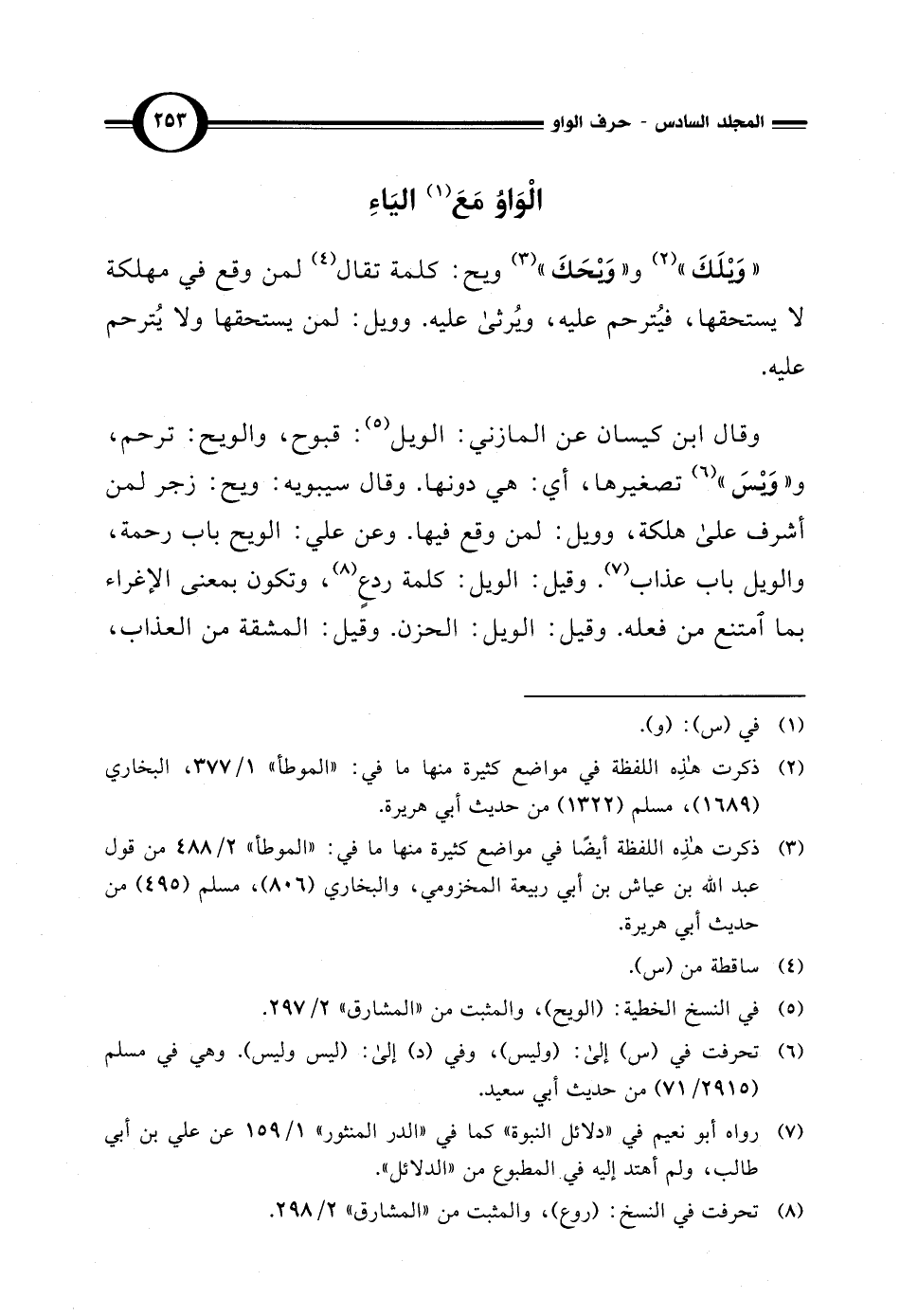 " وَيْلَكَ" (¬2) و"وَيْحَكَ" (¬3) ويح: كلمة تقال (¬4) لمن وقع في مهلكة لا يستحقها، فيُترحم عليه، ويُرثى عليه. وويل: لمن يستحقها ولا يُترحم عليه.