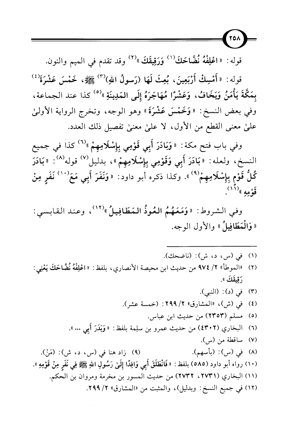 وفي باب فتح مكة: "وَبَادَرَ أَبِي قَوْمِي بِإِسْلَامِهِمْ" (¬6) كذا في جميع النسخ، ولعله: "بَادَرَ أَبِي وَقَوْمِي بِإِسْلَامِهِمْ"، بدليل (¬7) قوله (¬8): "بَادَرَ كُلُّ قَوْمٍ بِإِسْلَامِهِمْ (¬9) ". وكذا ذكره أبو داود: "وَنَفَرَ أَبِي مَعَ (¬10) نَفَرٍ مِنْ قَوْمِهِ" (¬11).