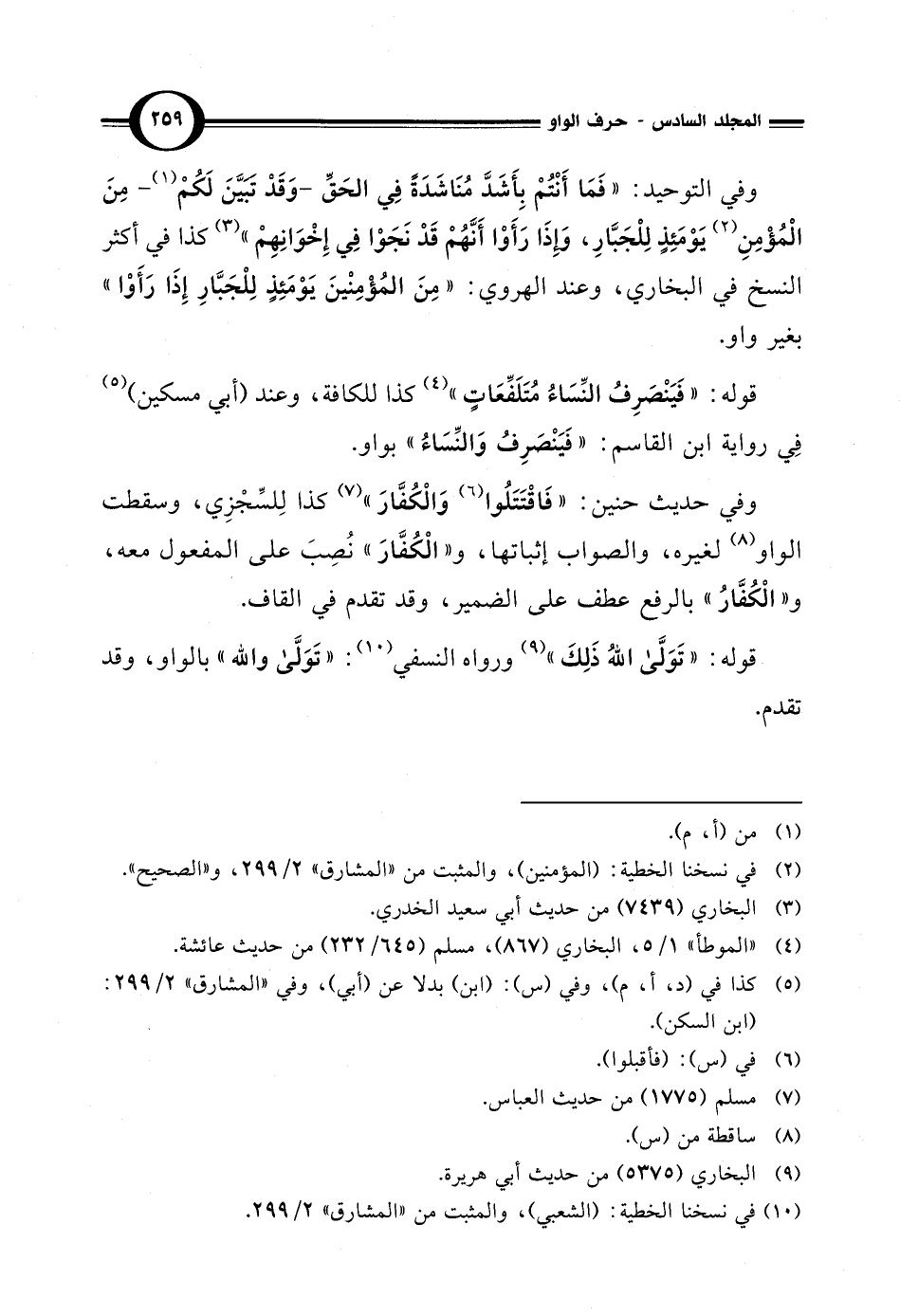 وفي التوحيد: "فَمَا أَنْتُمْ بِأَشَدَّ مُنَاشَدَةً في الحَقِّ - وَقَدْ تبَيَّنَ لَكُمْ (¬1) - مِنَ الْمُؤْمِنِ (¬2) يَوْمَئِذٍ لِلْجَبَّارِ، وَإِذَا رَأَوْا أَنَّهُمْ قَدْ نَجَوْا في إِخْوَانِهِمْ" (¬3) كذا في أكثر النسخ في البخاري، وعند الهروي: "مِنَ المُؤْمِنْينَ يَوْمَئِذٍ لِلْجَبَّارِ إِذَا رَأَوْا" بغير واو.