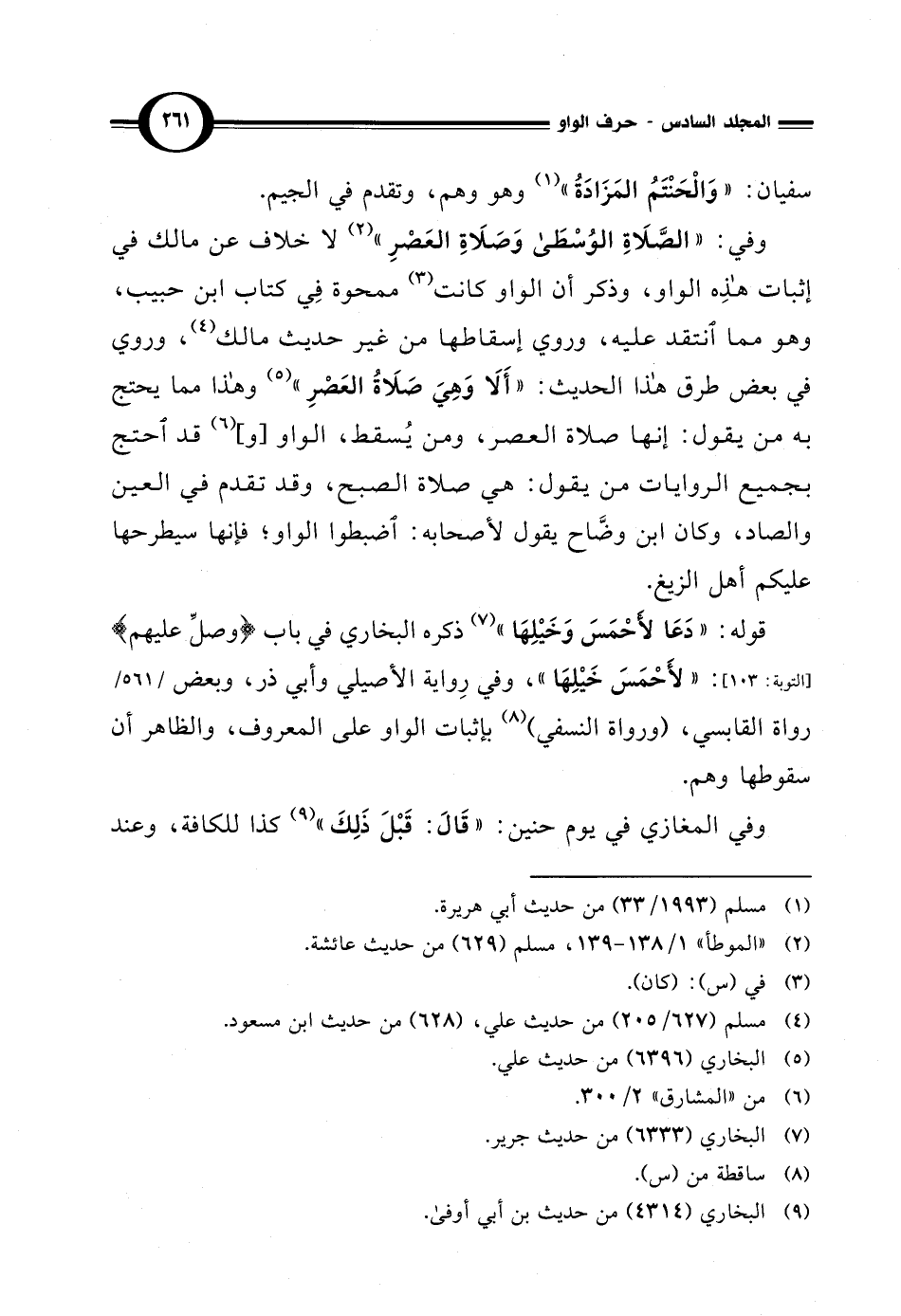 وفي: "الصَّلَاةِ الوُسْطَى وَصَلَاةِ العَصْرِ" (¬2) لا خلاف عن مالك في إثبات هذِه الواو، وذكر أن الواو كانت (¬3) ممحوة في كتاب ابن حبيب، وهو مما انتقد عليه، وروي إسقاطها من غير حديث مالك (¬4)، وروي في بعض طرق هذا الحديث: "أَلَا وَهِيَ صَلَاةُ العَصْرِ" (¬5) وهذا مما يحتج به من يقول: إنها صلاة العصر، ومن يُسقط، الواو [و] (¬6) قد احتج بجميع الروايات من يقول: هي صلاة الصبح، وقد تقدم في العين والصاد، وكان ابن وضَّاح يقول لأصحابه: اضبطوا الواو؛ فإنها سيطرحها عليكم أهل الزيغ.