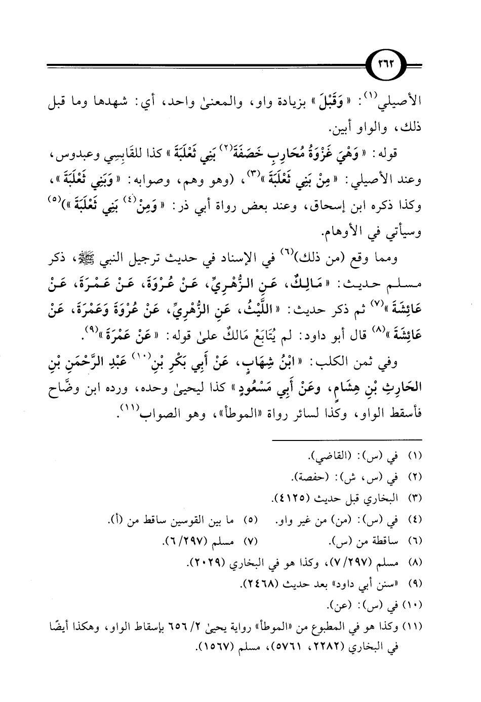 ومما وقع (من ذلك) (¬6) في الإسناد في حديث ترجيل النبي - صلى الله عليه وسلم -، ذكر مسلم حديث: "مَالِكٌ، عَنِ الزُّهْرِيِّ، عَنْ عُرْوَةَ، عَنْ عَمْرَةَ، عَنْ عَائِشَةَ" (¬7) ثم ذكر حديث: "اللَّيْثُ، عَنِ الزُّهْرِيِّ، عَنْ عُرْوَةَ وَعَمْرَةَ، عَنْ عَائِشَةَ" (¬8) قال أبو داود: لم يُتَابَعْ مَالكٌ على قوله: "عنْ عَمْرَةَ" (¬9).