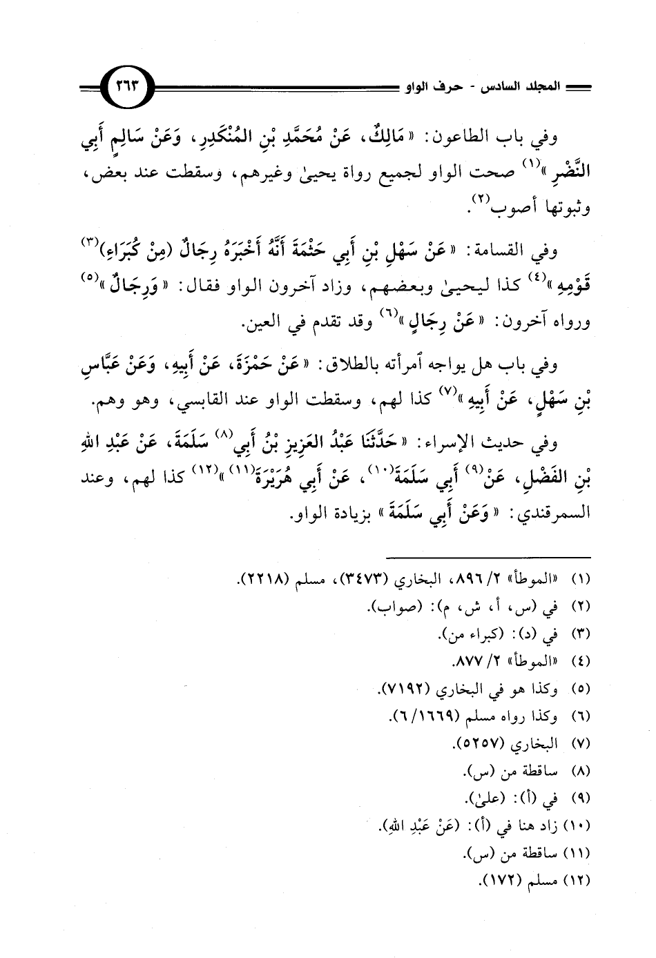 وفي باب الطاعون: "مَالِكٌ، عَنْ مُحَمَّدِ بْنِ المُنْكَدِرِ، وَعَنْ سَالِمٍ أَبِي النَّضْرِ" (¬1) صحت الواو لجميع رواة يحيى وغيرهم، وسقطت عند بعض، وثبوتها أصوب (¬2).