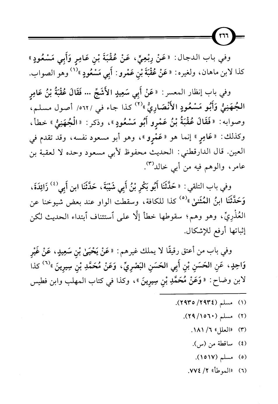 وفي باب إنظار المعسر: "عَنْ أَبِي سَعِيدٍ الأَشَجِّ ... فَقَالَ عُقْبَةُ بْنُ عَامِرٍ الجُهَنِيُّ وَأَبُو مَسْعُودٍ الأَنْصارِيُّ" (¬2) كذا جاء في أصول مسلم، وصوابه: "فَقَالَ عُقْبَةُ بْنُ عَمْرٍو أَبُو مَسْعُودٍ"، وذكر: "الْجُهَنِيُّ" خطأ، وكذلك: "عَامِرٍ" إنما هو "عَمْرٍو"، وهو أبو مسعود نفسه، وقد تقدم في العين. قال الدارقطني: الحديث محفوظ لأبي مسعود وحده لا لعقبة بن عامر، والوهم فيه من أبي خالد (¬3).