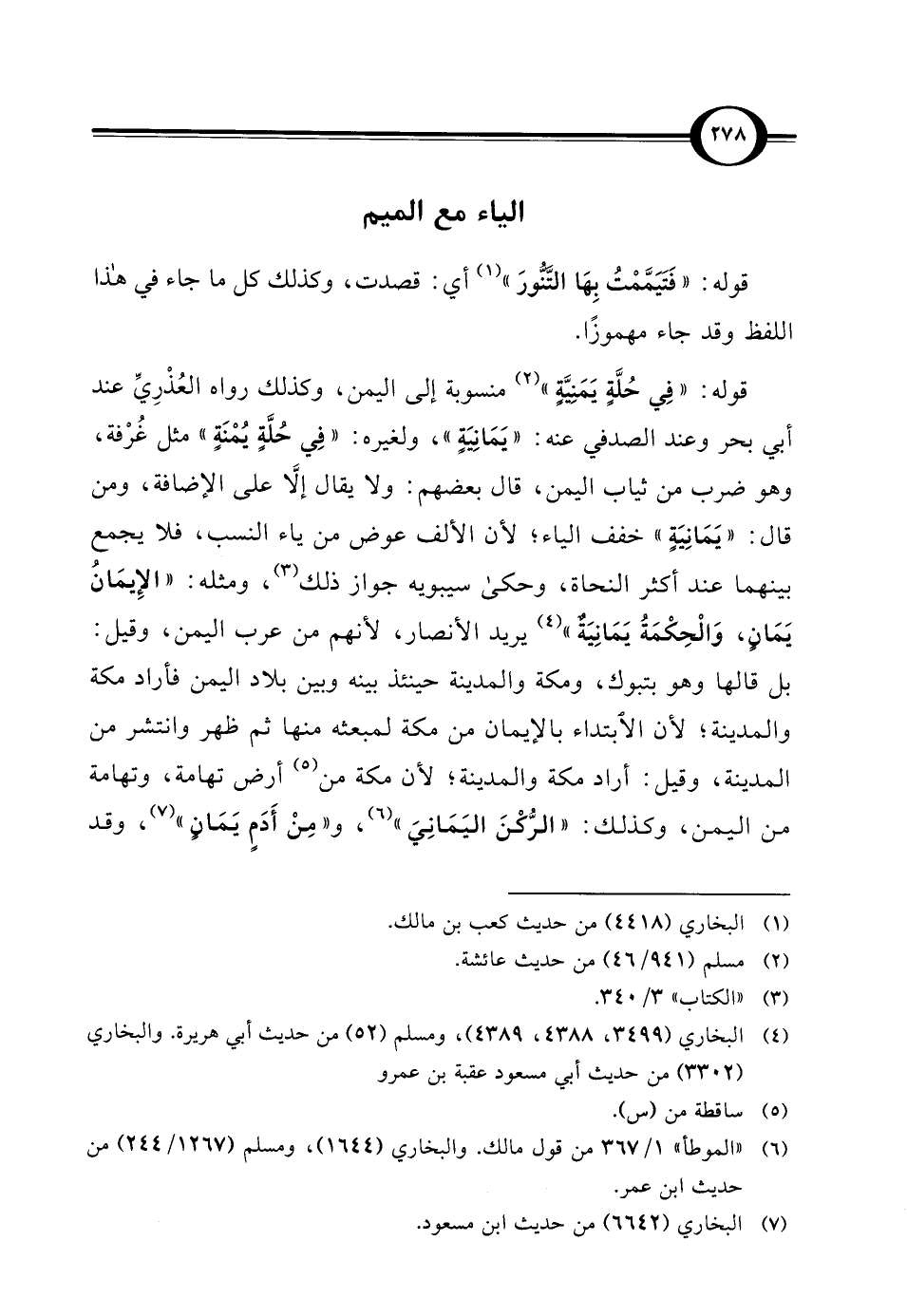 قوله: "في حُلَّةٍ يَمَنِيَّةٍ" (¬2) منسوبة إلى اليمن، وكذلك رواه العُذْرِيِّ عند أبي بحر وعند الصدفي عنه: "يَمَانِيَةٍ"، ولغيره: "في حُلَّةٍ يُمْنَةٍ" مثل غُرْفة، وهو ضرب من ثياب اليمن، قال بعضهم: ولا يقال إلاَّ على الإضافة، ومن قال: "يَمَانِيَةٍ" خفف الياء؛ لأن الألف عوض من ياء النسب، فلا يجمع بينهما عند أكثر النحاة، وحكى سيبويه جواز ذلك (¬3)، ومثله: "الإِيمَانُ يَمَانٍ، وَالْحِكْمَةُ يَمَانِيَةٌ" (¬4) يريد الأنصار, لأنهم من عرب اليمن، وقيل: بل قالها وهو بتبوك، ومكة والمدينة حينئذ بينه وبين بلاد اليمن فأراد مكة والمدينة؛ لأن الابتداء بالإيمان من مكة لمبعثه منها ثم ظهر وانتشر من المدينة، وقيل: أراد مكة والمدينة؛ لأن مكة من (¬5) أرض تهامة، وتهامة من اليمن، وكذلك: "الرُّكْنَ اليَمَانِيَ" (¬6)، و"مِنْ أَدَمٍ يَمَانٍ" (¬7)، وقد