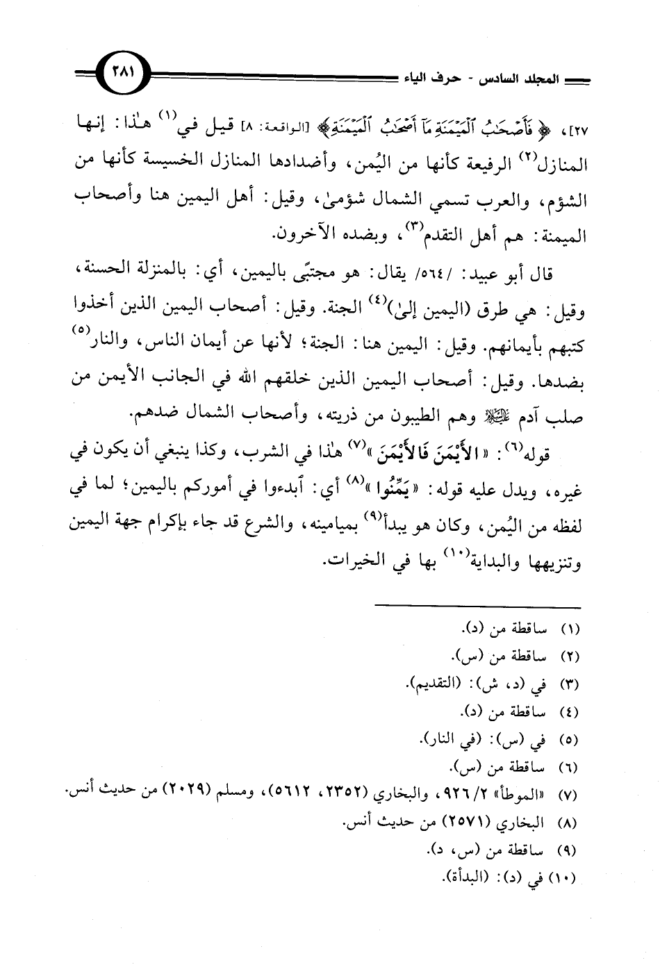 27]، {فَأَصْحَابُ الْمَيْمَنَةِ مَا أَصْحَابُ الْمَيْمَنَةِ} [الواقعة: 8] قيل في (¬1) هذا: إنها المنازل (¬2) الرفيعة كأنها من اليُمن، وأضدادها المنازل الخسيسة كأنها من الشؤم، والعرب تسمي الشمال شؤمى، وقيل: أهل اليمين هنا وأصحاب الميمنة: هم أهل المتقدم (¬3)، وبضده الآخرون.