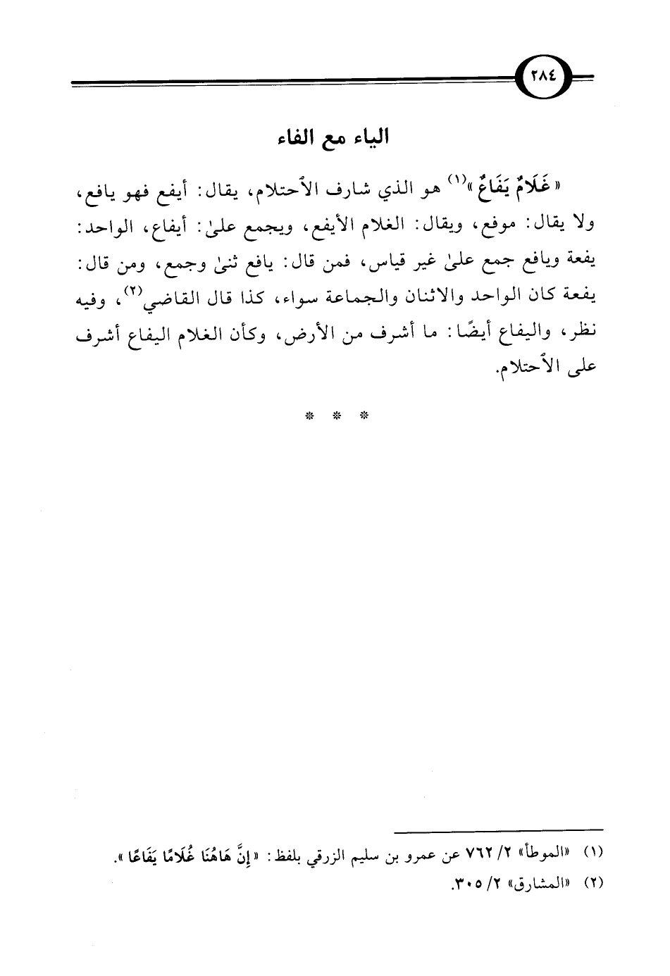 " غَلَامٌ يَفَاعٌ" (¬1) هو الذي شارف الاحتلام، يقال: أيفع فهو يافع، ولا يقال: موفع، ويقال: الغلام الأيفع، ويجمع على: أيفاع، الواحد: يفعة ويافع جمع على غير قياس، فمن قال: يافع ثنى وجمع، ومن قال: يفعة كان الواحد والاثنان والجماعة سواء، كذا قال القاضي (¬2)، وفيه نظر، واليفاع أيضًا: ما أشرف من الأرض، وكأن الغلام اليفاع أشرف على الاحتلام.