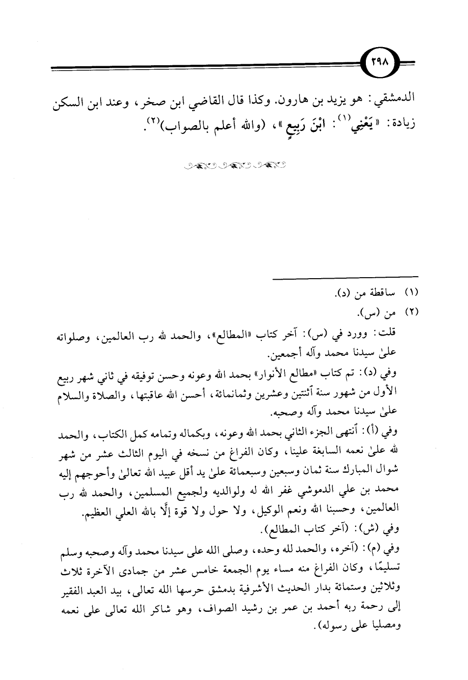 (¬2) من (س). قلت: وورد في (س): آخر كتاب "المطالع"، والحمد لله رب العالمين، وصلواته على سيدنا محمد وآله أجمعين. وفي (د): تم كتاب "مطالع الأنوار" بحمد الله وعونه وحسن توفيقه في ثاني شهر ربيع الأول من شهور سنة اثنتين وعشرين وثمانمائة، أحسن الله عاقبتها، والصلاة والسلام على سيدنا محمد وآله وصحبه. وفي (أ): انتهى الجزء الثاني بحمد الله وعونه، وبكماله وتمامه كمل الكتاب، والحمد لله على نعمه السابغة علينا، وكان الفراغ من نسخه في اليوم الثالث عشر من شهر شوال المبارك سنة ثمان وسبعين وسبعمائة على يد أقل عبيد الله تعالى وأحوجهم إليه محمد بن علي الدموشي غفر الله له ولوالديه ولجميع المسلمين، والحمد لله رب العالمين، وحسبنا الله ونعم الوكيل، ولا حول ولا قوة إلَّا بالله العلي العظيم. وفي (ش): (آخر كتاب المطالع). وفي (م): (آخره، والحمد لله وحده، وصلى الله على سيدنا محمد وآله وصحبه وسلم تسليمًا، وكان الفراغ منه مساء يوم الجمعة خامس عشر من جمادى الآخرة ثلاث وثلاثين وستمائة بدار الحديث الأشرفية بدمشق حرسها الله تعالى، بيد العبد الفقير إلى رحمة ربه أحمد بن عمر بن رشيد الصواف، وهو شاكر الله تعالى على نعمه ومصليا على رسوله).