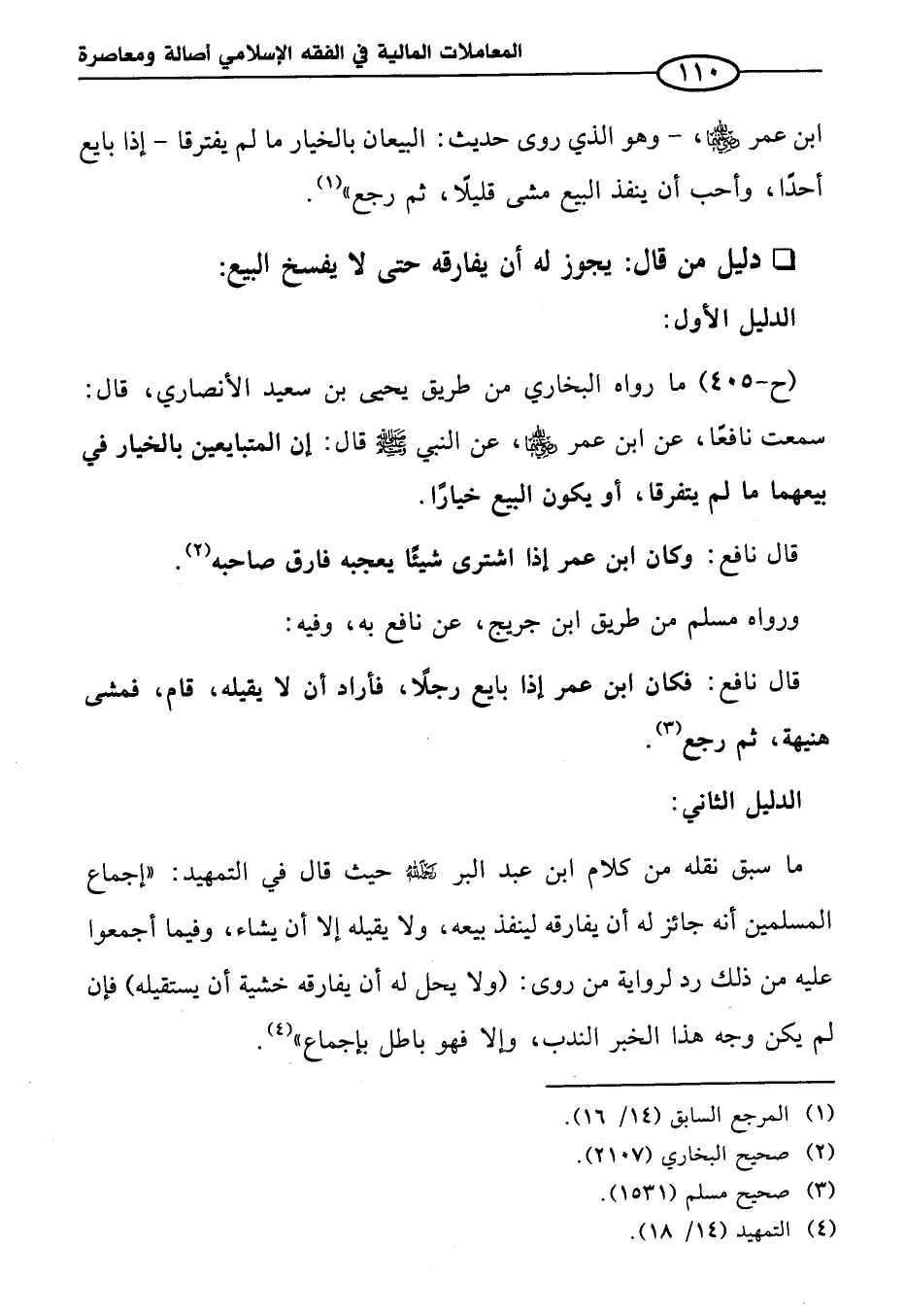 (ح-٤٠٥) ما رواه البخاري من طريق يحيى بن سعيد الأنصاري، قال: سمعت نافعًا، عن ابن عمر - رضي الله عنهما -، عن النبي - صلى الله عليه وسلم - قال: إن المتبايعين بالخيار في بيعهما ما لم يتفرقا، أو يكون البيع خيارًا.