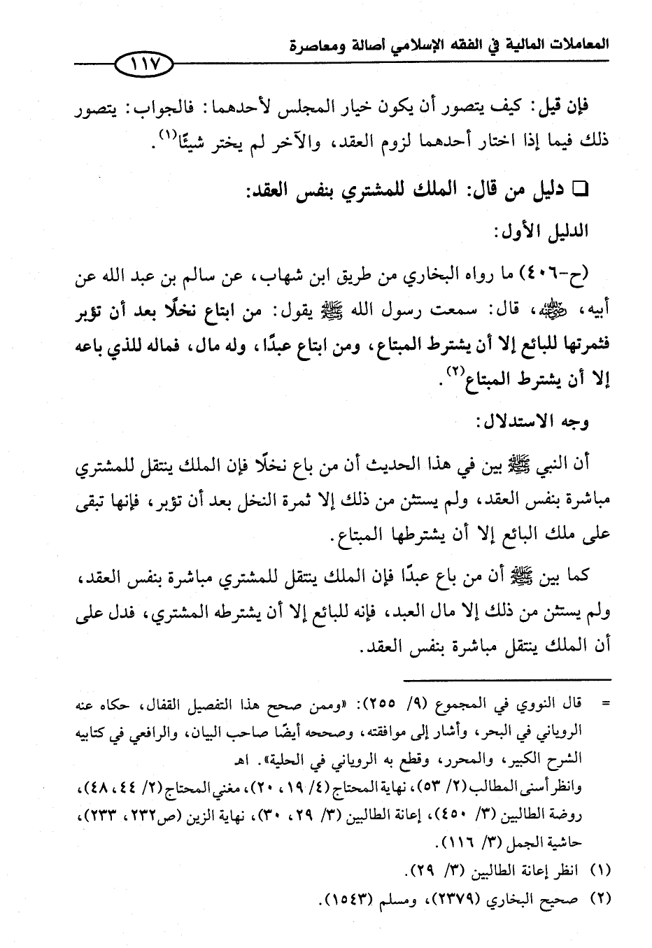 (ح-٤٠٦) ما رواه البخاري من طريق ابن شهاب، عن سالم بن عبد الله عن أبيه، - رضي الله عنه -، قال: سمعت رسول الله - صلى الله عليه وسلم - يقول: من ابتاع نخلاً بعد أن تؤبر فثمرتها للبائع إلا أن يشترط المبتاع، ومن ابتاع عبدًا, وله مال، فماله للذي باعه إلا أن يشترط المبتاع (¬٢).