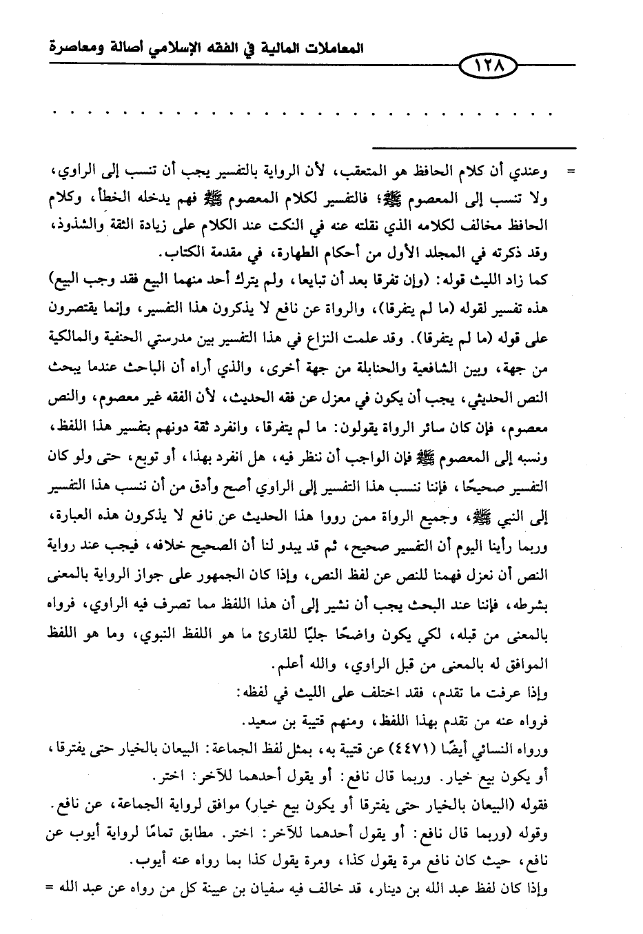 كما زاد الليث قوله: (وإن تفرقا بعد أن تبايعا, ولم يترك أحد منهما البيع فقد وجب البيع) هذه تفسير لقوله (ما لم يتفرقا)، والرواة عن نافع لا يذكرون هذا التفسير، وإنما يقتصرون على قوله (ما لم يتفرقا). وقد علمت النزاع في هذا التفسير بين مدرستي الحنفية والمالكية من جهة، وبين الشافعية والحنابلة من جهة أخرى، والذي أراه أن الباحث عندما يبحث النص الحديثي، يجب أن يكون في معزل عن فقه الحديث؛ لأن الفقه غير معصوم، والنص معصوم، فإن كان سائر الرواة يقولون: ما لم يتفرقا، وانفرد ثقة دونهم بتفسير هذا اللفظ، ونسبه إلى المعصوم - صلى الله عليه وسلم - فإن الواجب أن ننظر فيه، هل انفرد بهذا، أو توبع، حتى ولو كان التفسير صحيحًا، فإننا ننسب هذا التفسير إلى الراوي أصح وأدق من أن ننسب هذا التفسير إلى النبي - صلى الله عليه وسلم -، وجميع الرواة ممن رووا هذا الحديث عن نافع لا يذكرون هذه العبارة، وربما رأينا اليوم أن التفسير صحيح، ثم قد يبدو لنا أن الصحيح خلافه، فيجب عند رواية النص أن نعزل فهمنا للنص عن لفظ النص، وإذا كان الجمهور على جواز الرواية بالمعنى بشرطه، فإننا عند البحث يجب أن نشير إلى أن هذا اللفظ مما تصرف فيه الراوي، فرواه بالمعنى من قبله، لكي يكون واضحًا جليًا للقارئ ما هو اللفظ النبوي، وما هو اللفظ الموافق له بالمعنى من قبل الراوي، والله أعلم.