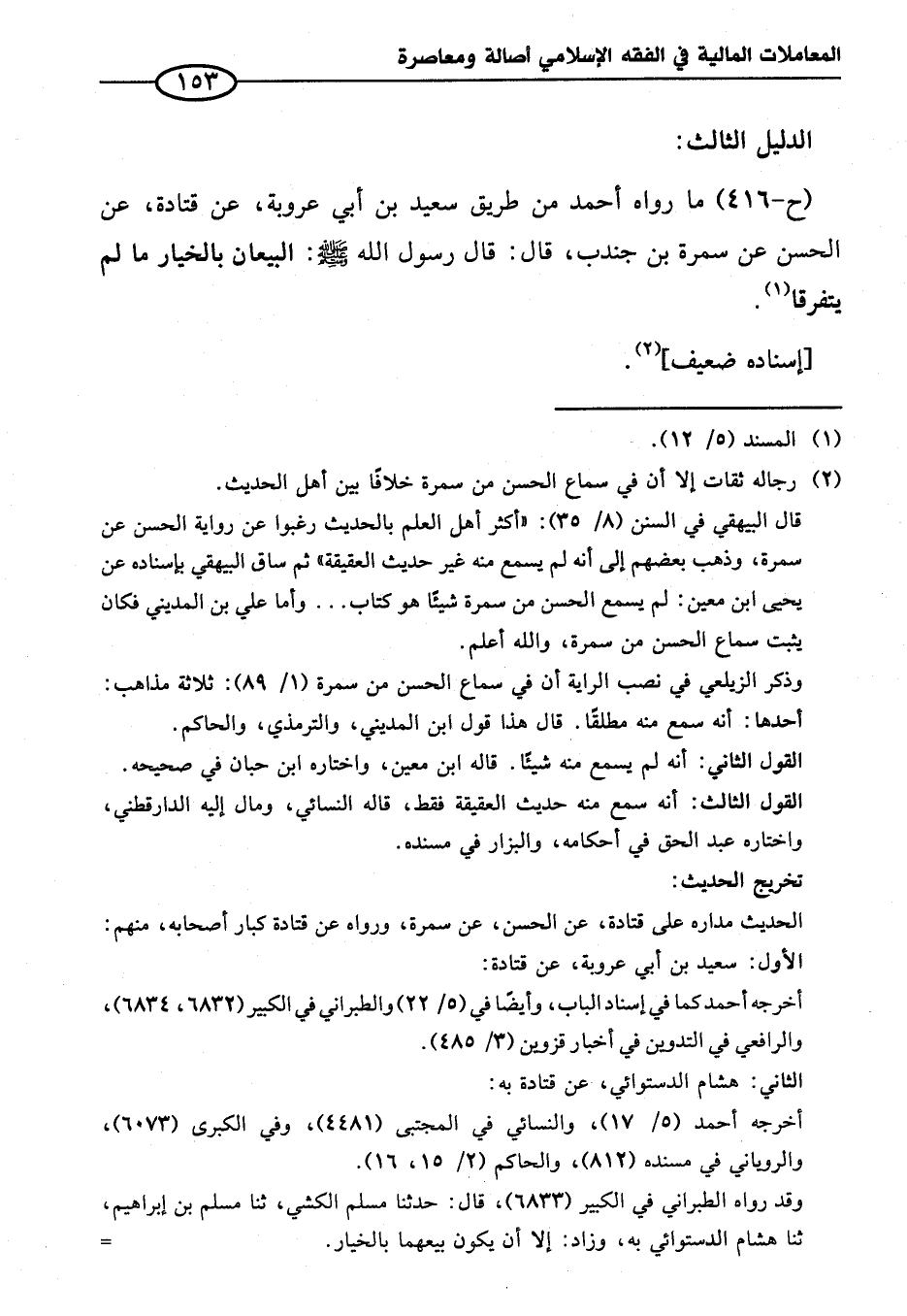 (ح-٤١٦) ما رواه أحمد من طريق سعيد بن أبي عروبة، عن قتادة، عن الحسن عن سمرة بن جندب، قال: قال رسول الله - صلى الله عليه وسلم -: البيعان بالخيار ما لم يتفرقا (¬١).