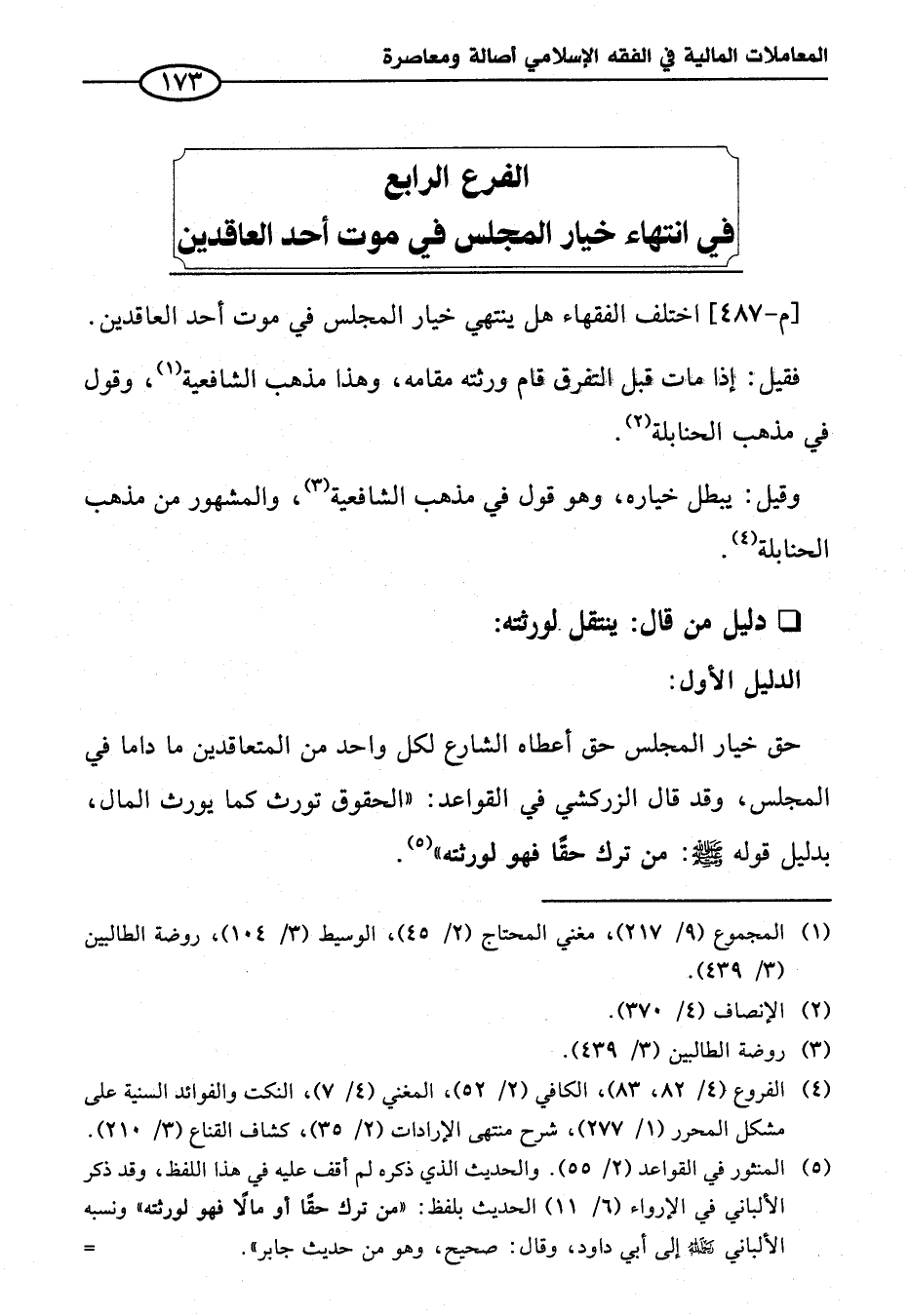 الفرع الرابع في انتهاء خيار المجلس في موت أحد العاقدين