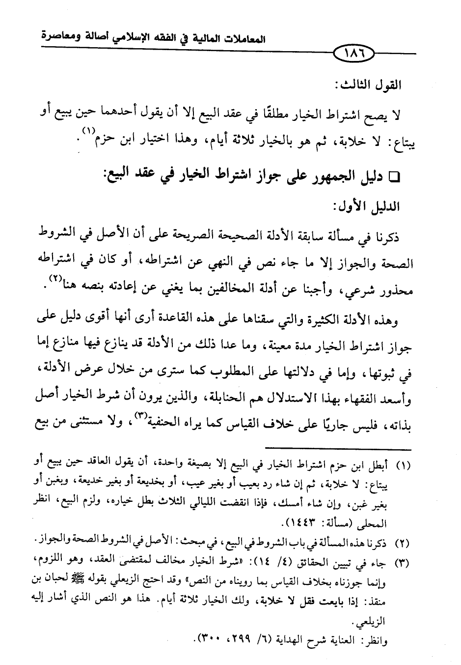 (¬٣) جاء في تبيين الحقائق (٤/ ١٤): "شرط الخيار مخالف لمقتضى العقد، وهو اللزوم، وإنما جوزناه بخلاف القياس بما رويناه من النص" وقد احتج الزيلعي بقوله - صلى الله عليه وسلم - لحبان بن منقذ: إذا بايعت فقل لا خلابة، ولك الخيار ثلاثة أيام. هذا هو النص الذي أشار إليه الزيلعي.
