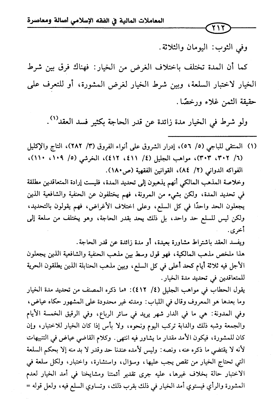 كما أن المدة تختلف باختلاف الغرض من الخيار: فهناك فرق بين شرط الخيار لاختبار السلعة، وبين شرط الخيار لغرض المشورة، أو للتعرف على حقيقة الثمن غلاء ورخصًا.