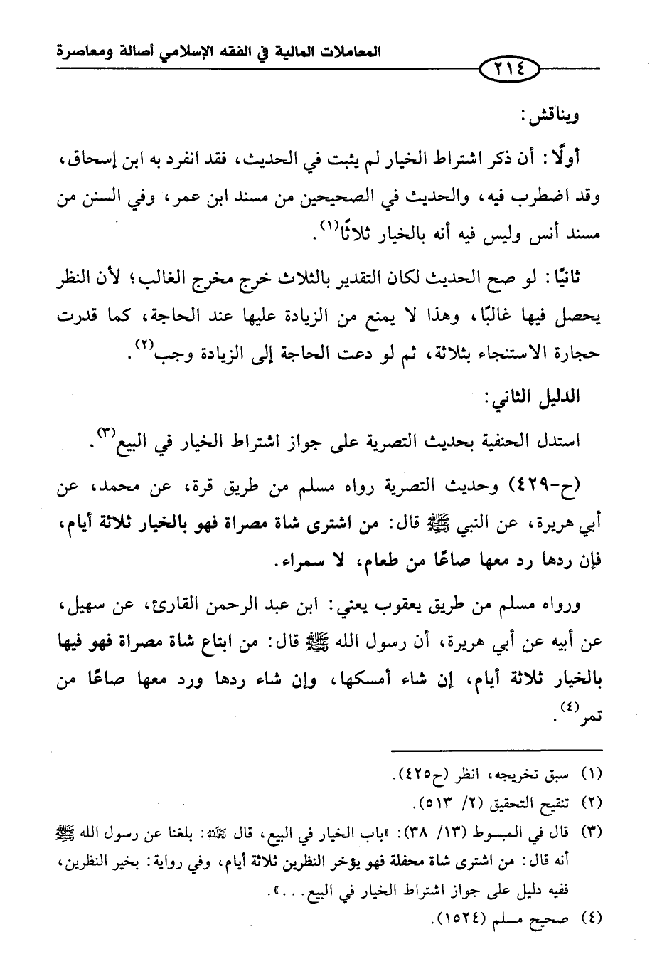 (¬٣) قال في المبسوط (١٣/ ٣٨): "باب الخيار في البيع، قال - رحمه الله -: بلغنا عن رسول الله - صلى الله عليه وسلم - أنه قال: من اشترى شاة محفلة فهو يؤخر النظرين ثلاثة أيام، وفي رواية: بخير النظرين، ففيه دليل على جواز اشتراط الخيار في البيع ... ".