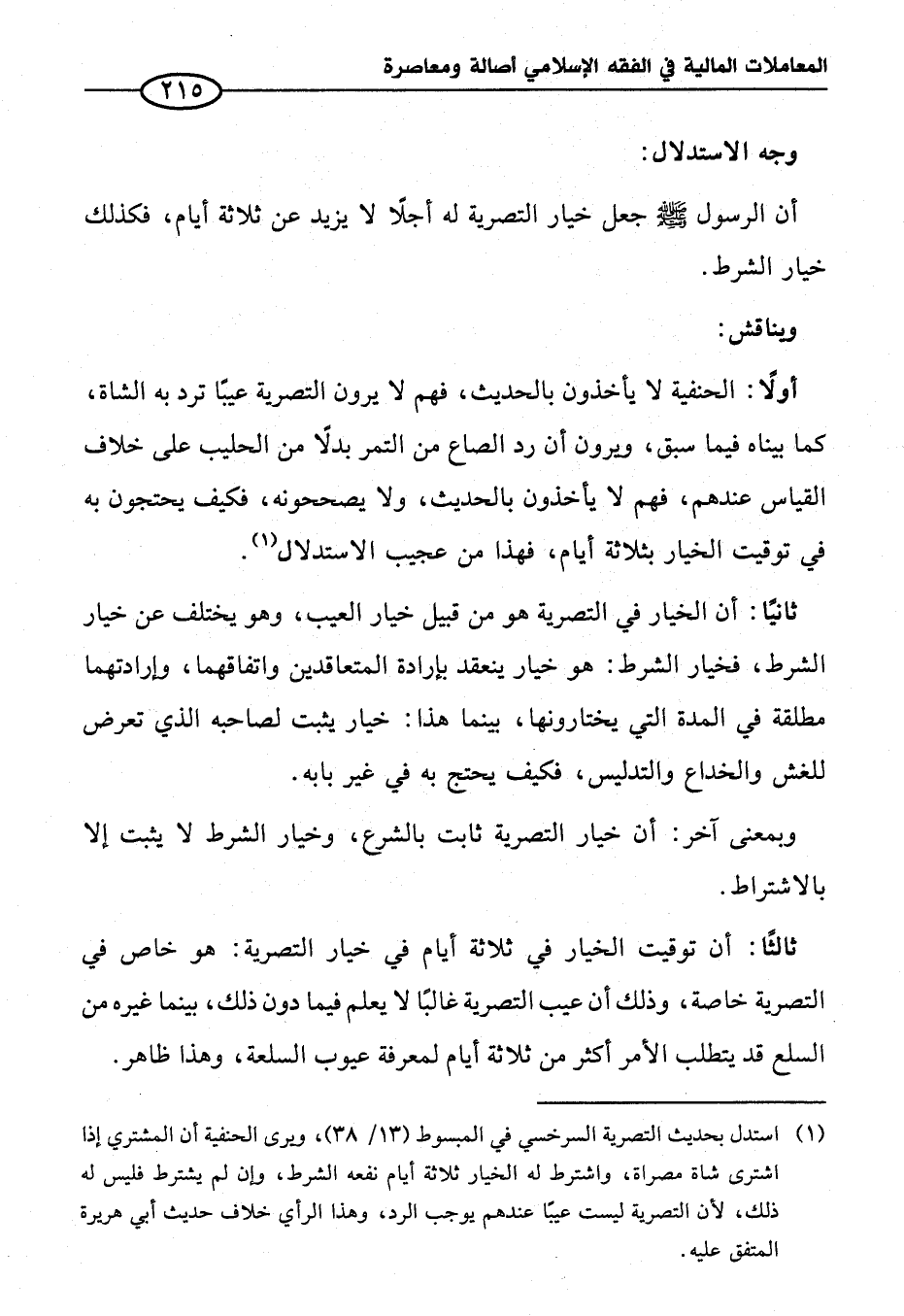 أولاً: الحنفية لا يأخذون بالحديث، فهم لا يرون التصرية عيبًا ترد به الشاة، كما بيناه فيما سبق، ويرون أن رد الصاع من التمر بدلاً من الحليب على خلاف القياس عندهم، فهم لا يأخذون بالحديث، ولا يصححونه، فكيف يحتجون به في توقيت الخيار بثلاثة أيام، فهذا من عجيب الاستدلال (¬١).