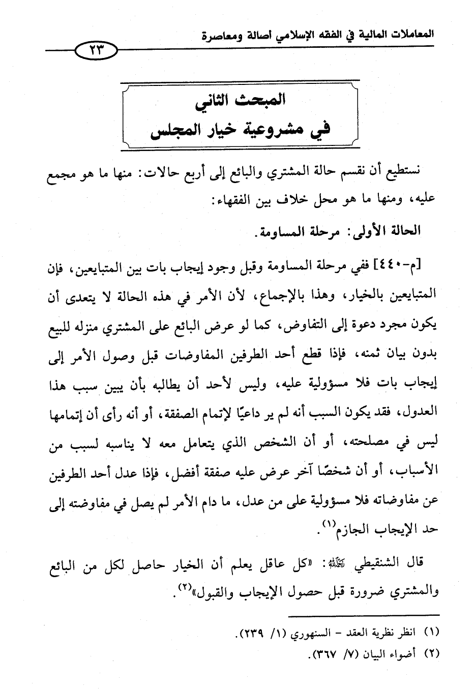 [م - ٤٤٠] ففي مرحلة المساومة وقبل وجود إيجاب بات بين المتبايعين، فإن المتبايعين بالخيار، وهذا بالإجماع؛ لأن الأمر في هذه الحالة لا يتعدى أن يكون مجرد دعوة إلى التفاوض، كما لو عرض البائع على المشتري منزله للبيع بدون بيان ثمنه، فإذا قطع أحد الطرفين المفاوضات قبل وصول الأمر إلى إيجاب بات فلا مسؤولية عليه، وليس لأحد أن يطالبه بأن يبين سبب هذا العدول، فقد يكون السبب أنه لم ير داعيًا لإتمام الصفقة، أو أنه رأى أن إتمامها ليس في مصلحته، أو أن الشخص الذي يتعامل معه لا يناسبه لسبب من الأسباب، أو أن شخصًا آخر عرض عليه صفقة أفضل، فإذا عدل أحد الطرفين عن مفاوضاته فلا مسؤولية على من عدل، ما دام الأمر لم يصل في مفاوضته إلى حد الإيجاب الجازم (¬١).
