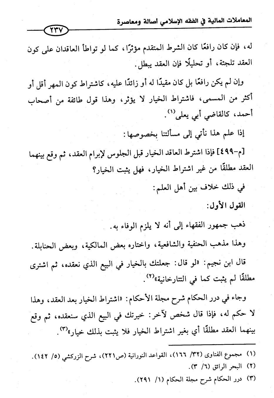وجاء في درر الحكام شرح مجلة الأحكام: "اشتراط الخيار بعد العقد، وهذا لا حكم له، فإذا قال شخص لآخر: خيرتك في البيع الذي سنعقده، ثم وقع بينهما العقد مطلقاً أي بغير اشتراط الخيار فلا يثبت بذلك خيار" (¬٣).