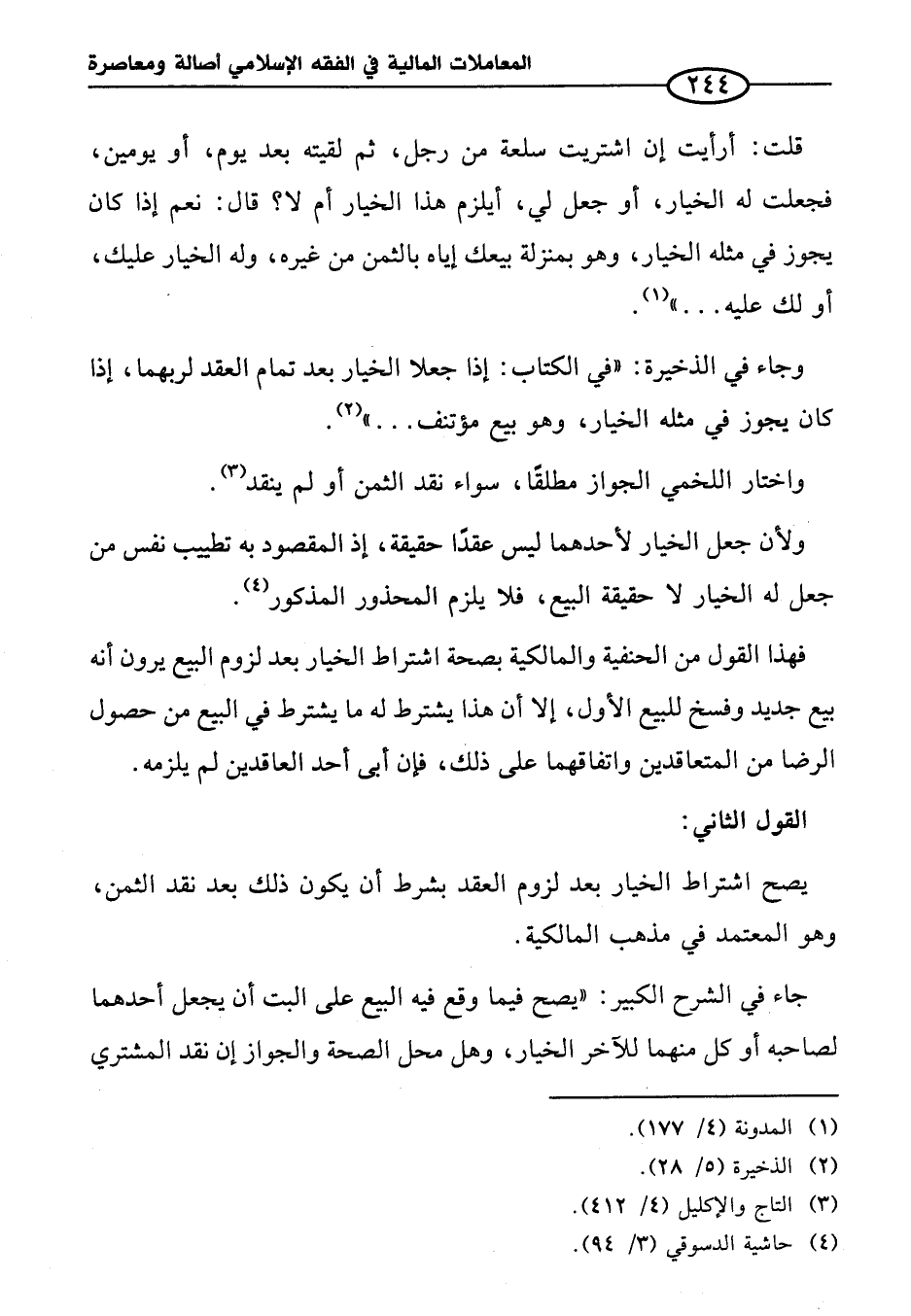 قلت: أرأيت إن اشتريت سلعة من رجل، ثم لقيته بعد يوم، أو يومين، فجعلت له الخيار، أو جعل لي، أيلزم هذا الخيار أم لا؟ قال: نعم إذا كان يجوز في مثله الخيار، وهو بمنزلة بيعك إياه بالثمن من غيره، وله الخيار عليك، أو لك عليه ... " (¬١).