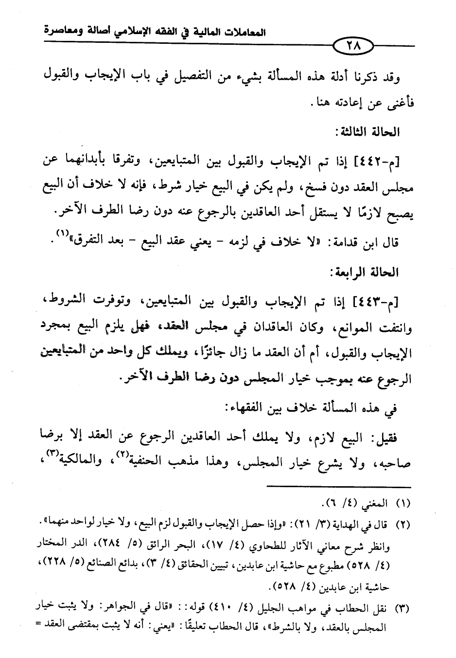 (¬٣) نقل الحطاب في مواهب الجليل (٤/ ٤١٠) قوله: "قال في الجواهر: ولا يثبت خيار المجلس بالعقد، ولا بالشرط"، قال الحطاب تعليقًا: "يعني: أنه لا يثبت بمقتضى العقد =