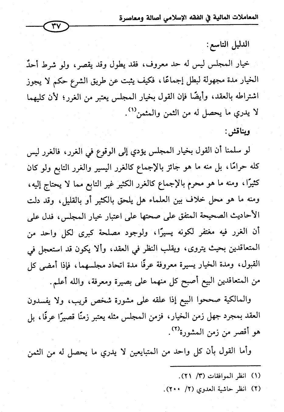 خيار المجلس ليس له حد معروف، فقد يطول وقد يقصر، ولو شرط أحدٌ الخيار مدة مجهولة لبطل إجماعًا، فكيف يثبت عن طريق الشرع حكم لا يجوز اشتراطه بالعقد، وأيضًا فإن القول بخيار المجلس يعتبر من الغرر؛ لأن كليهما لا يدري ما يحصل له من الثمن والمثمن (¬١).